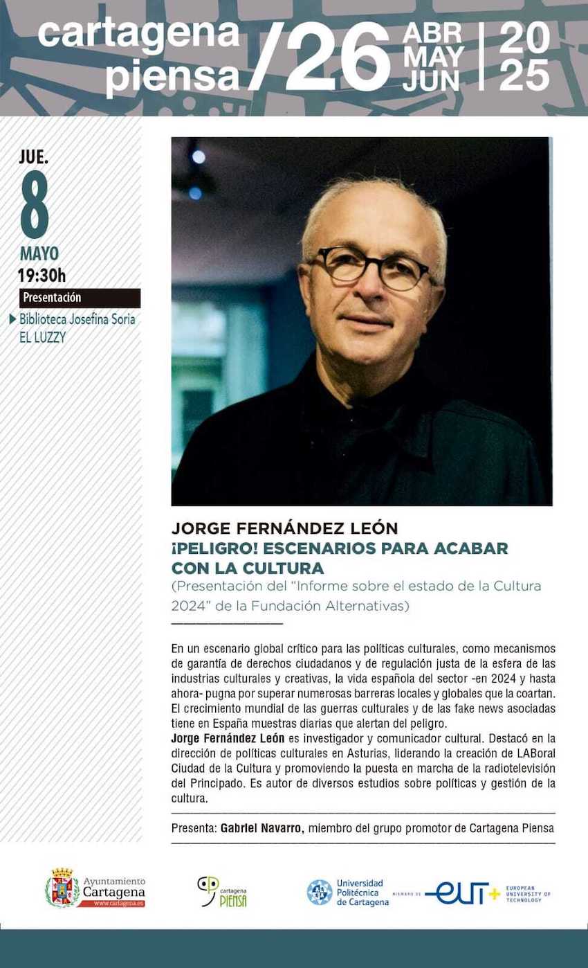 Cartagena Piensa, el programa impulsado por el grupo promotor y Cultura del ayuntamiento, recibe hoy, en el centro cultural El Luzzy, al investigador y comunicador Jorge Fernández León para analizar la evolución de las políticas culturales. Entrada gratuita.