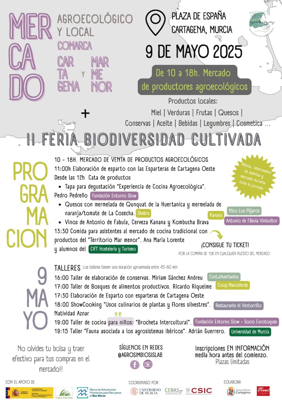 La plaza de España de Cartagena acoge este viernes 9 de mayo el mercado agroecológico y la II Feria Biodiversidad Cultivada, organizada por AgrosimbiosisLab y que cuenta con el apoyo de Ayuntamiento de Cartagena. Desde las 10:00 horas y hasta las 18:00 horas, los interesados podrán adquirir productos agroecológico locales y participar en las diferentes actividades y talleres que se desarrollarán en este espacio. El evento se llevará a cabo el primer viernes de cada mes.