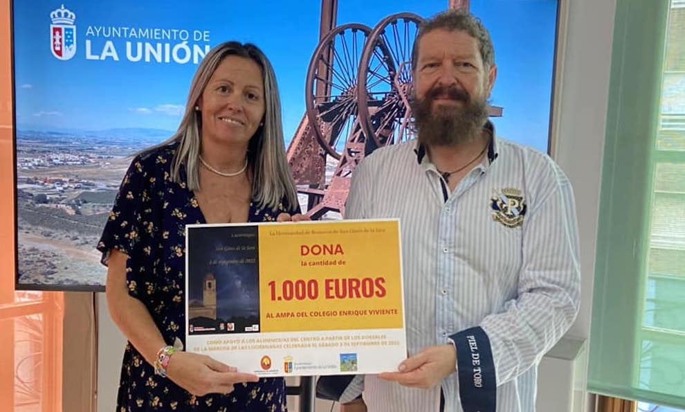 La marcha nocturna de ‘Las luciérnagas’ organizada por la Hermandad de Romeros de San Gines de la Jara ha donado 1.000 euros al AMPA del colegio de educación especial ‘Enrique Viviente’ de La Unión. El hermano mayor, Andrés García Andreo, ha hecho entrega hoy del cheque a la tesorera del AMPA, Paqui González, quien ha anunciado que esta suma se destinará a regalos de Navidad para los más de setenta alumnos del centro, entre los 3 y 21 años.