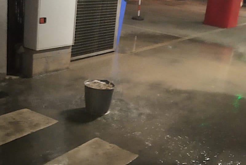 El cielo sobre Cartagena se ha ido ennegreciendo conforme avanzada la jornada y con la caída del sol ha tenido lugar una fuerte tormenta, con especial incidencia por la zona norte del municipio y en otros puntos como en El Algar y en el arco sur del Mar Menor hacia Los Alcázares y San Pedro del Pinatar. El agua, entre otros trastornos, ha ocasionado goteras en diversos inmuebles, como en el aparcamiento subterráneo del hospital de Santa Lucía, desde donde un lector nos envía esta imagen al llamarle la atención que se haya colocado "un cubo tan pequeño para una caída de agua importante", indica.