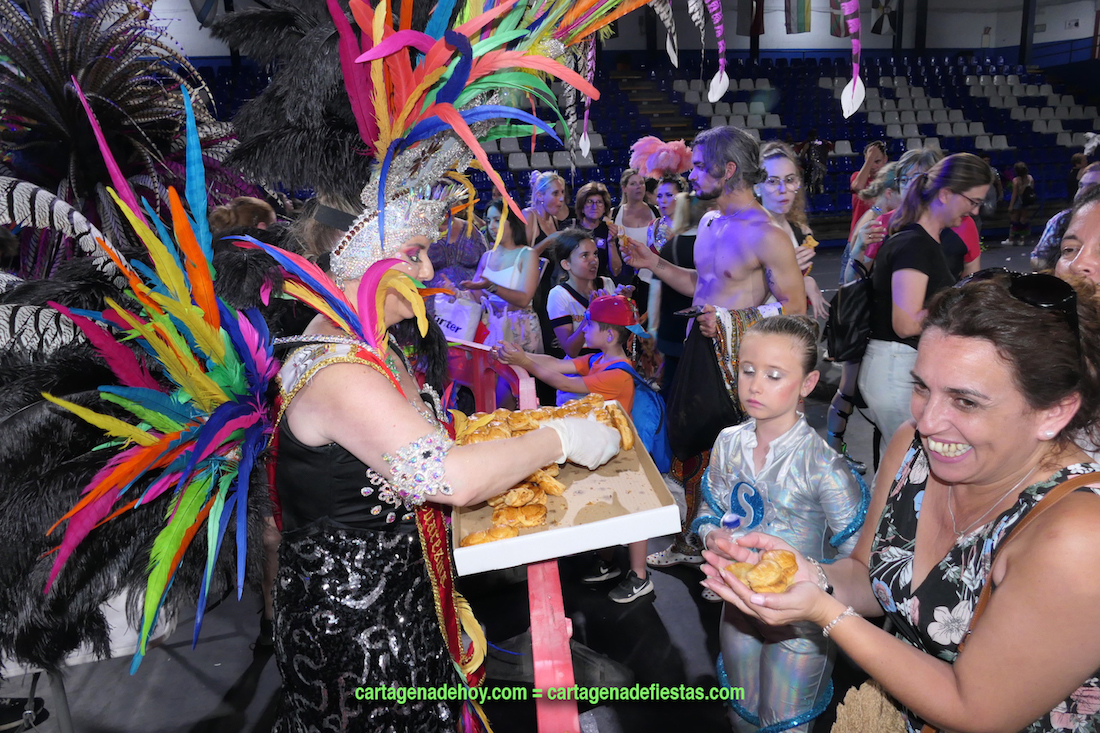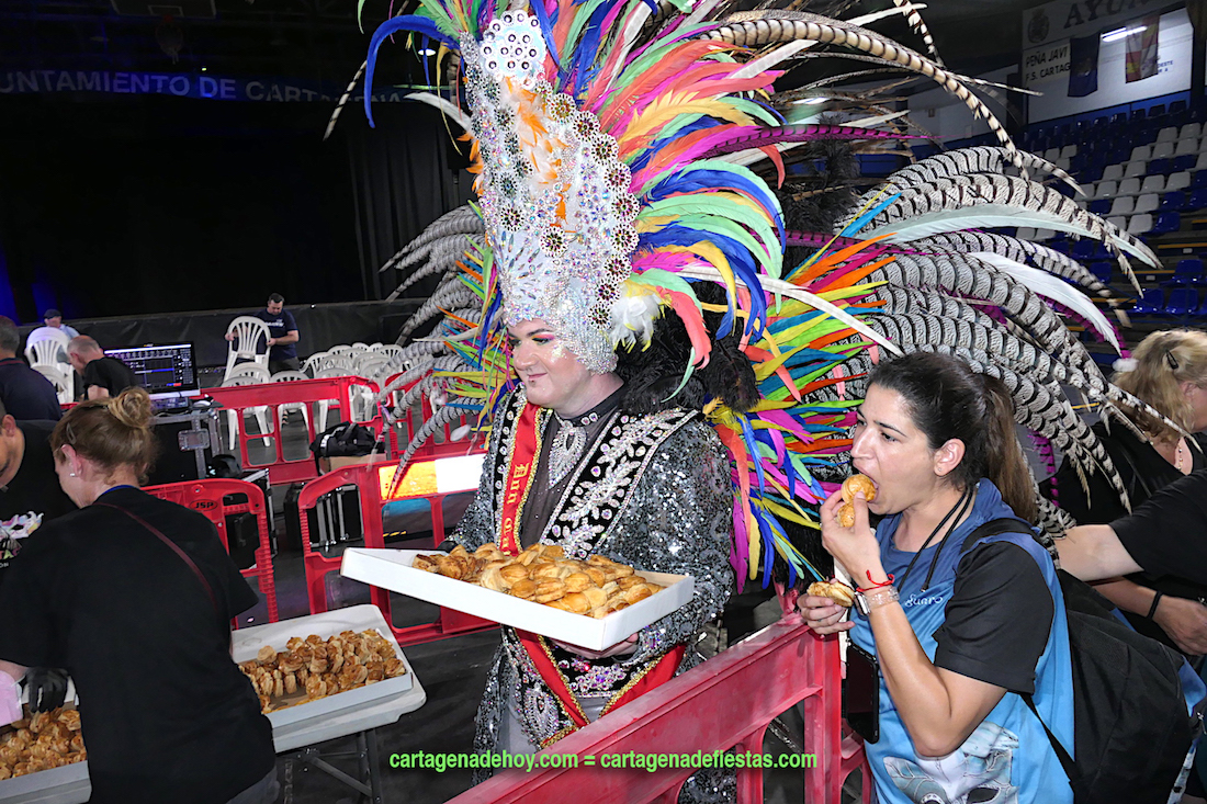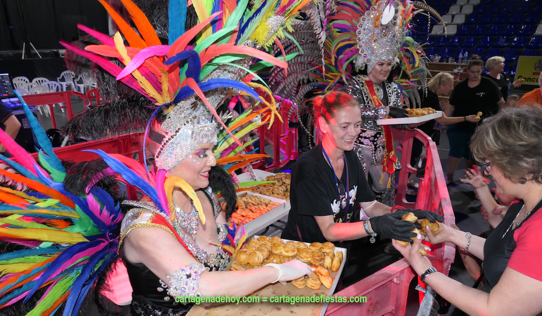 Tras concluir el capítulo de la entrega de premios del 41 Carnaval de Cartagena, tuvo lugar la tradicional degustación de ‘Las pelotas de don Carnal’ y ‘Las tetillas de doña Cuaresma’, que repartieron dentro del pabellón los personajes encarnados este año por José Félix Díaz Parrón y María José Aznar Castro, de la comparsa Salgueiro.