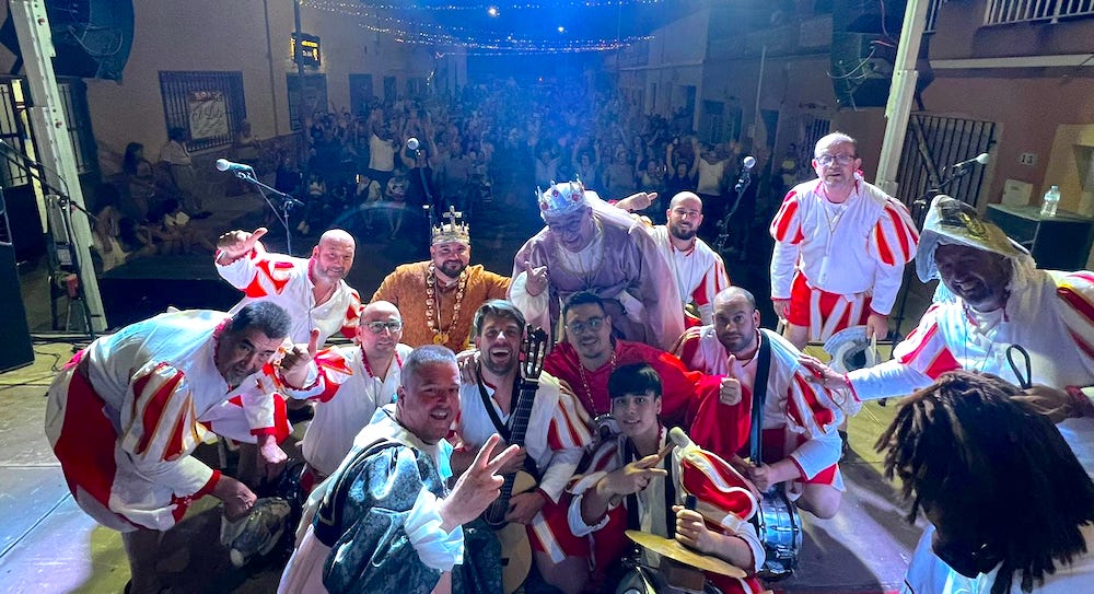 El grupo carnavalero de la villa y condado de Santa Lucía, cabe recordar, ha sido el ganador del certamen regional de chirigotas celebrado en junio en el Carnaval de Cartagena (pinchar aquí). Su puesta en escena fue '¡Que bien, que bien, hoy comemos con Isabel!', que representaba a la época de los Reyes Católicos, siendo este vestuario el que lucen en sus actuaciones por las fiestas populares este verano.