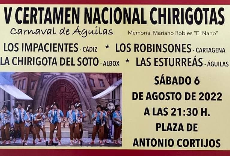La chirigota de Santa Lucía participó este pasado fin de semana en el quinto certamen nacional del carnaval aguileño 'Memorial Mariano Robles-El Nano', como se observa en la fotografía adjunta. Esta noche estará en las fiestas de Isla Plana.