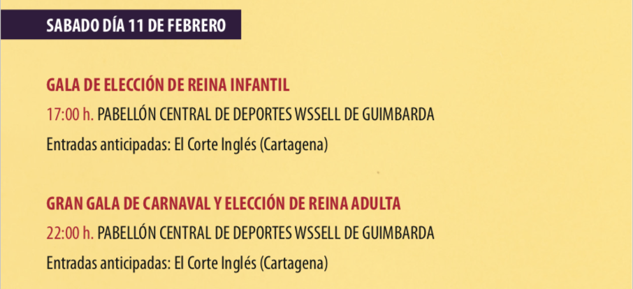 De esta jornada saldrán las reinas de la edición de 2023, celebrándose ambas galas en el pabellón Wssell de Guimbarda. También será el día en el que debuten Don Carnal y Doña Cuaresma de 2023, que son Pablo Juan Mainar y María del Pilar Vidal, de la comparsa Ipanema, mientras que los hermanos Belmonte y Daniela Navarro, de El Llano del Beal, los representan en edad infantil.