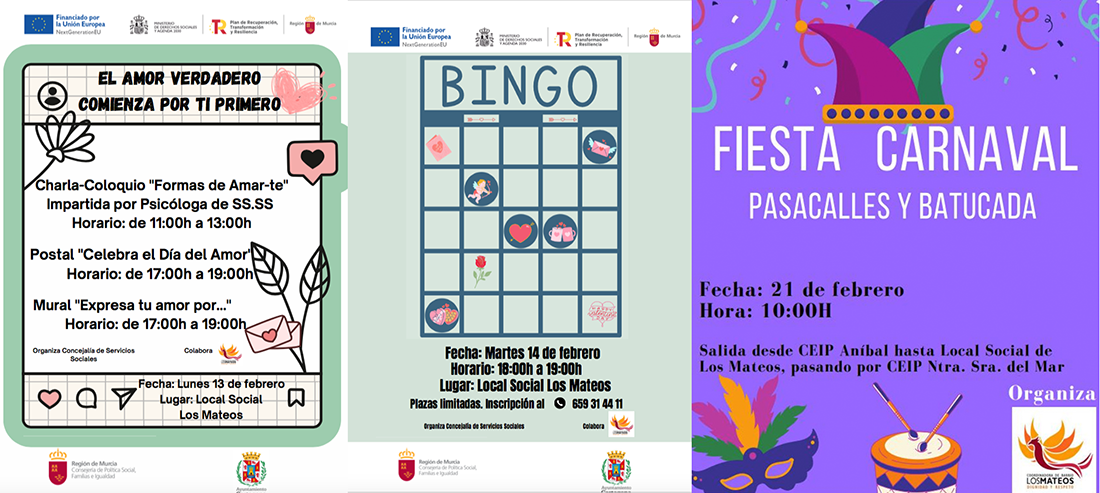 A lo largo de este mes de febrero, el barrio de Los Mateos vivirá intensamente las festividades del Día de San Valentín y el Carnaval con toda una variedad de actividades que se han organizado desde la Concejalía de Servicios Sociales del Ayuntamiento de Cartagena en el marco de los Fondos del Plan de Recuperación, Transformación y Resiliencia de la Comunidad Autónoma de Murcia.