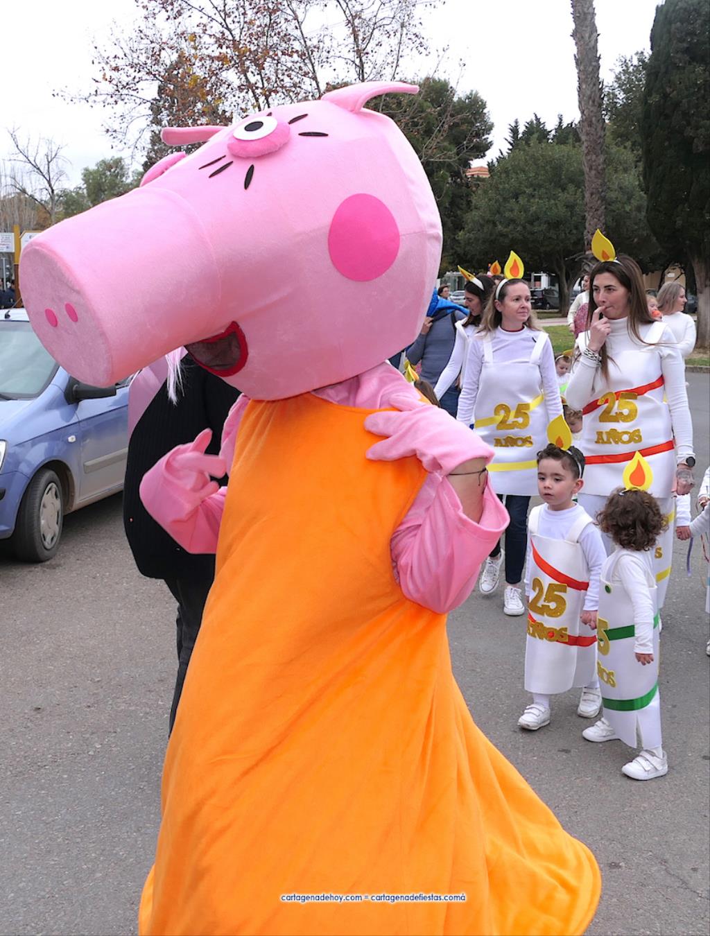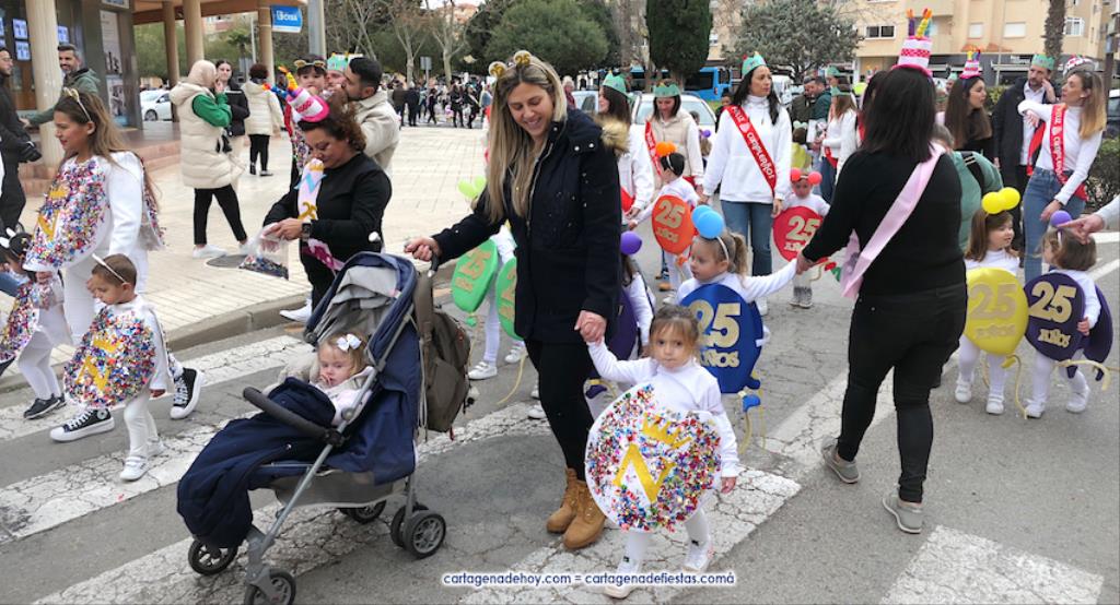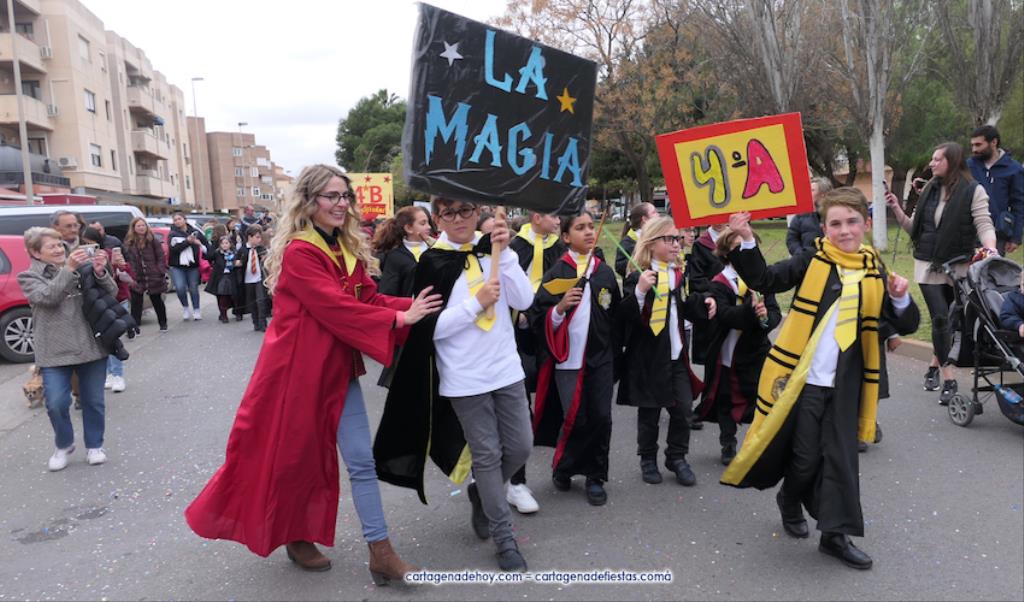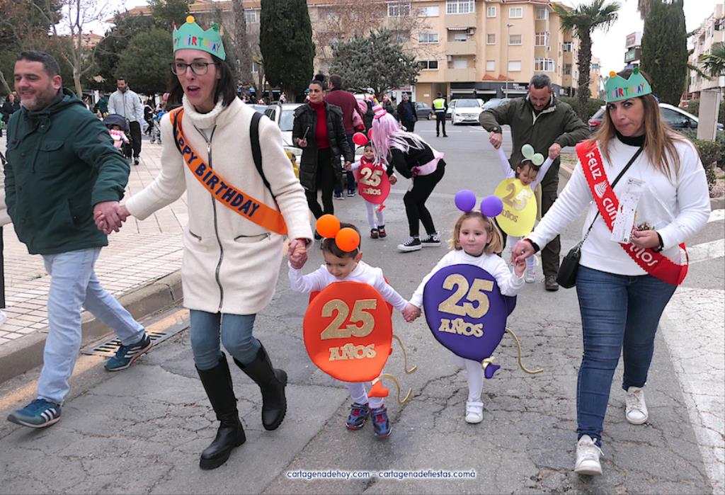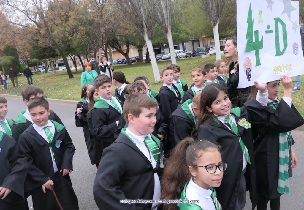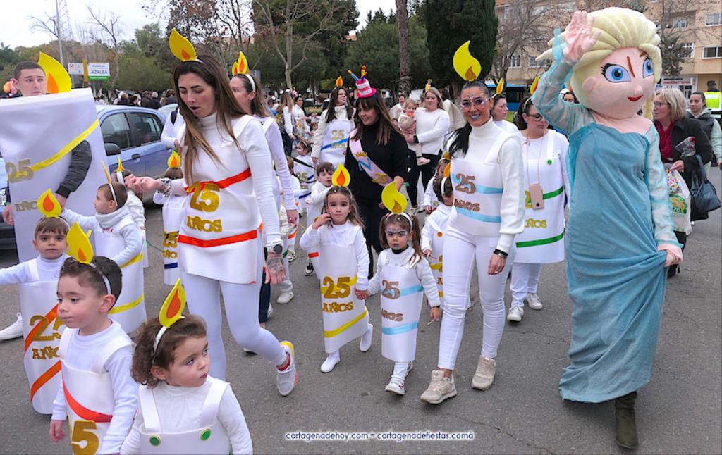 Por delante iban cientos de escolares con vestuarios tan variados como imaginativos, además de varias referencias al 25 aniversario de la cooperativa de enseñanza. Como se observa en la galería de fotos adjunta, hubo personajes Disney, representaciones humanas de velas (con la llama en al cabeza), disfraces de oficios (agricultores, mineros, pescadores, electricistas, camareros...), de rockeros, del mágico mundo de Harry Potter, vestuarios típicos de países del mundo, deportes...