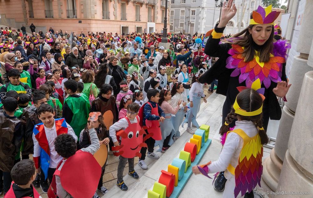 Más de un millar de estudiantes de Educación Primaria han llenado hoy las calles de Cartagena de color y alegría con motivo del desfile escolar de Carnaval, que ha comenzado sobre las 11 horas en la plaza de la Lonja y ha recorrido las calles Santa Florentina, Carmen, San Roque, Jabonerías, Puertas de Murcia, Plaza de San Sebastián y Mayor, hasta concluir en la Plaza del Ayuntamiento, donde se ha realizado una exhibición coreográfica.