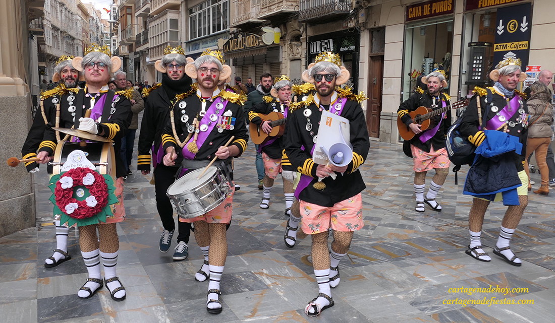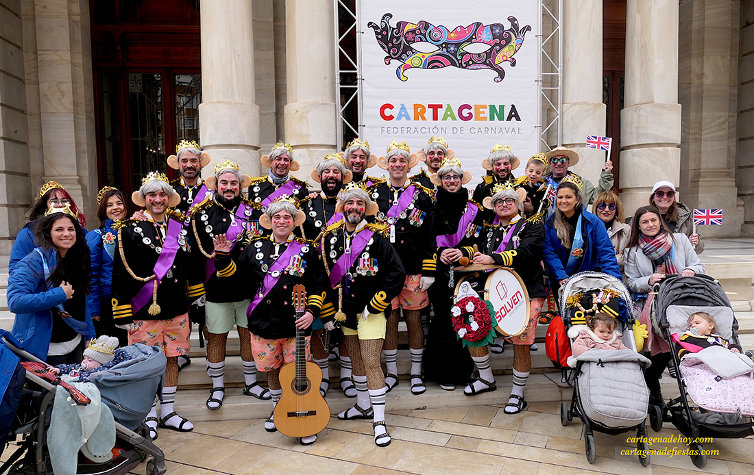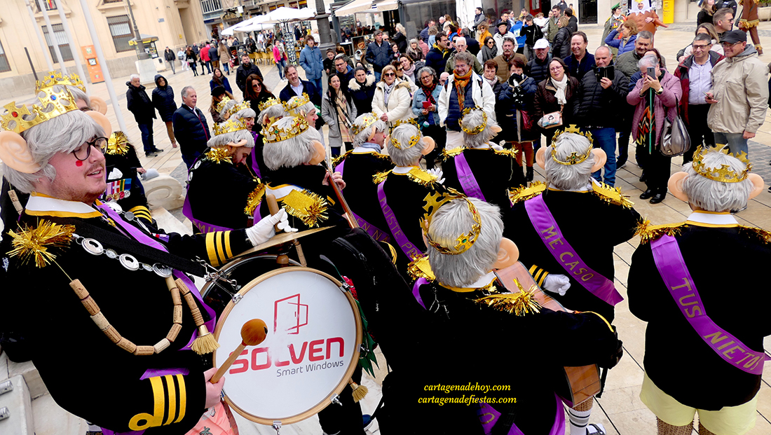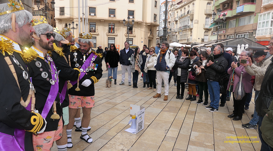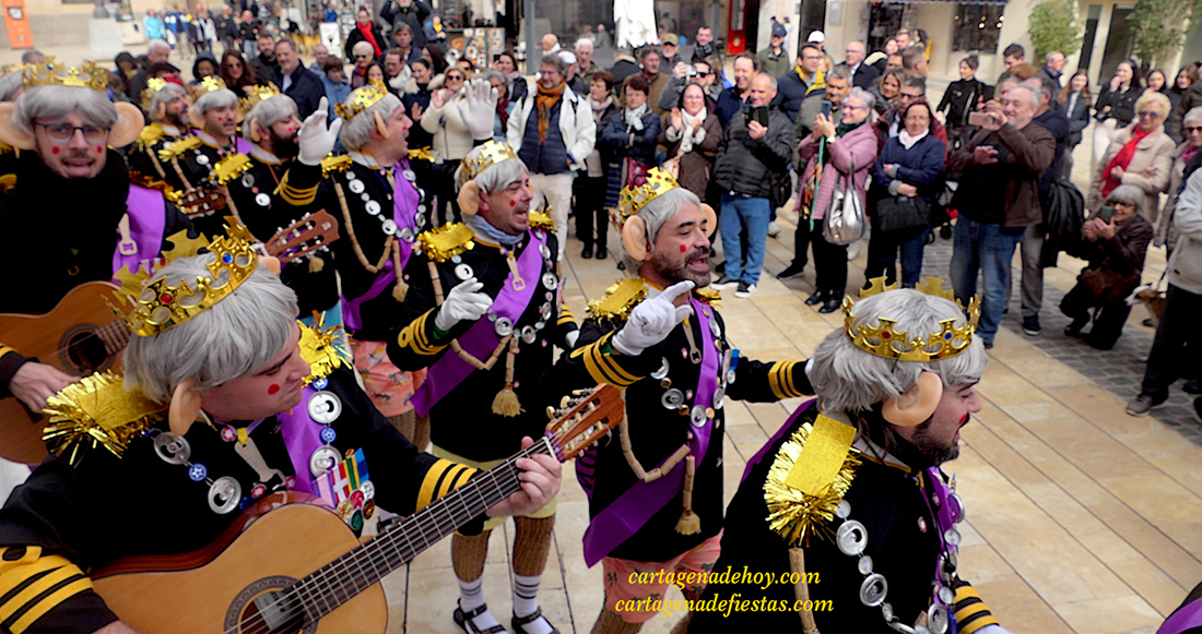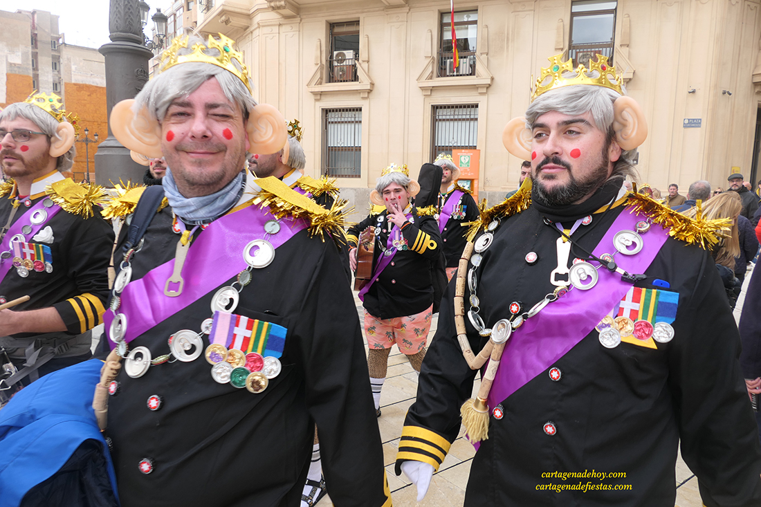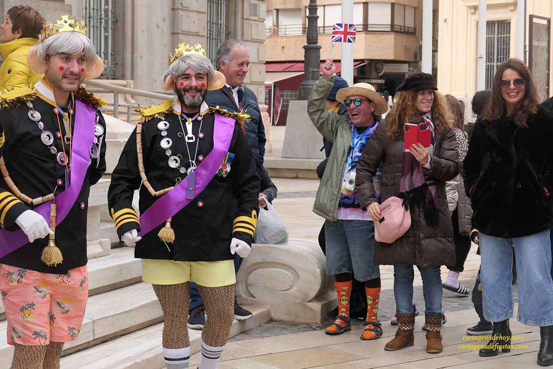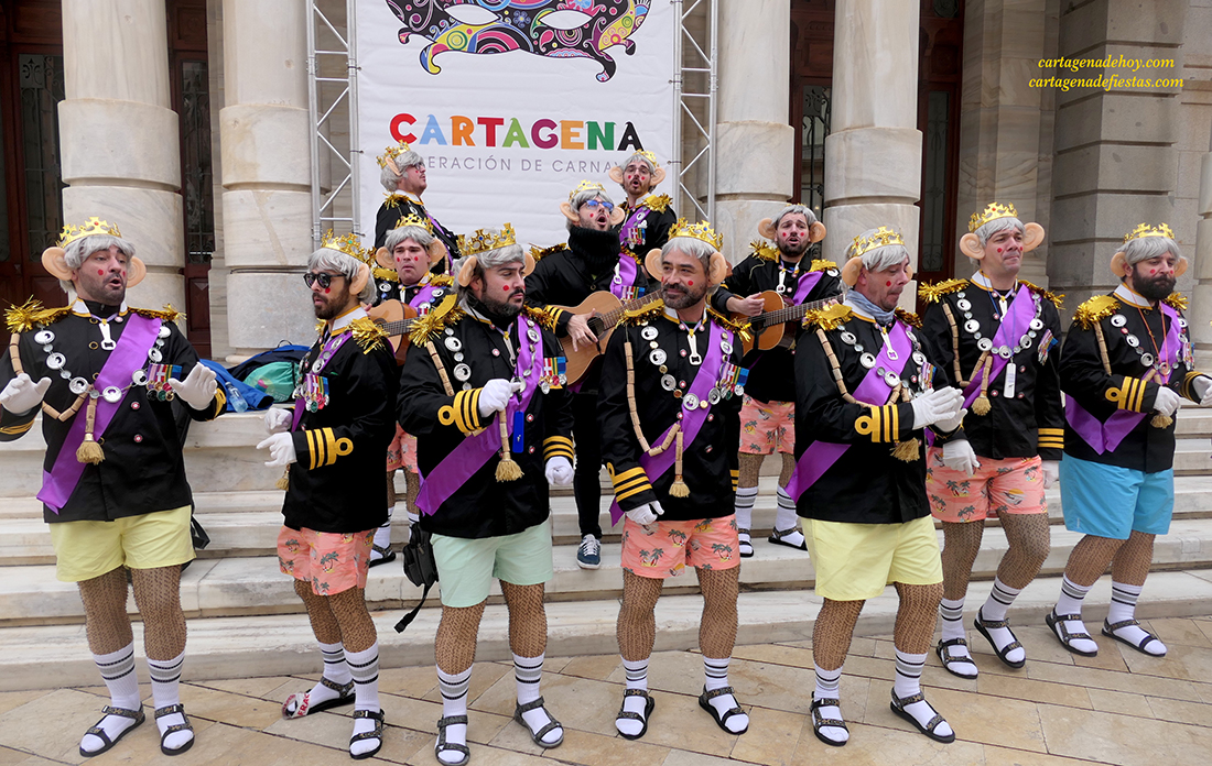 El grupo cartagenero repite experiencia de ofrecer sus chirigotas exclusivamente en la vía pública, habiendo elegido este año la representación del rey inglés Carlos III, "a quien la muerte de la reina Isabel le pilló cuando estaba de fiesta", apuntan quienes han dio ataviados con coronas, peluca canosa y grandes orejas durante su recorrido del fin de semana por la ciudad.