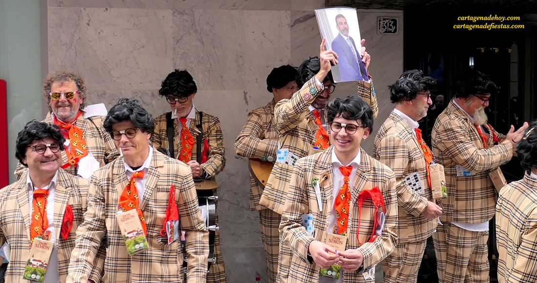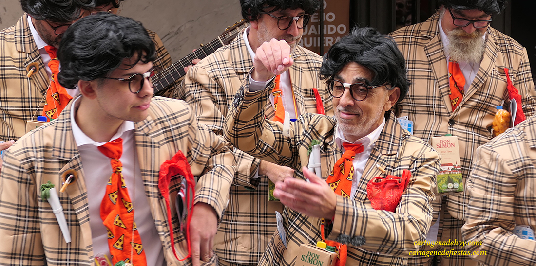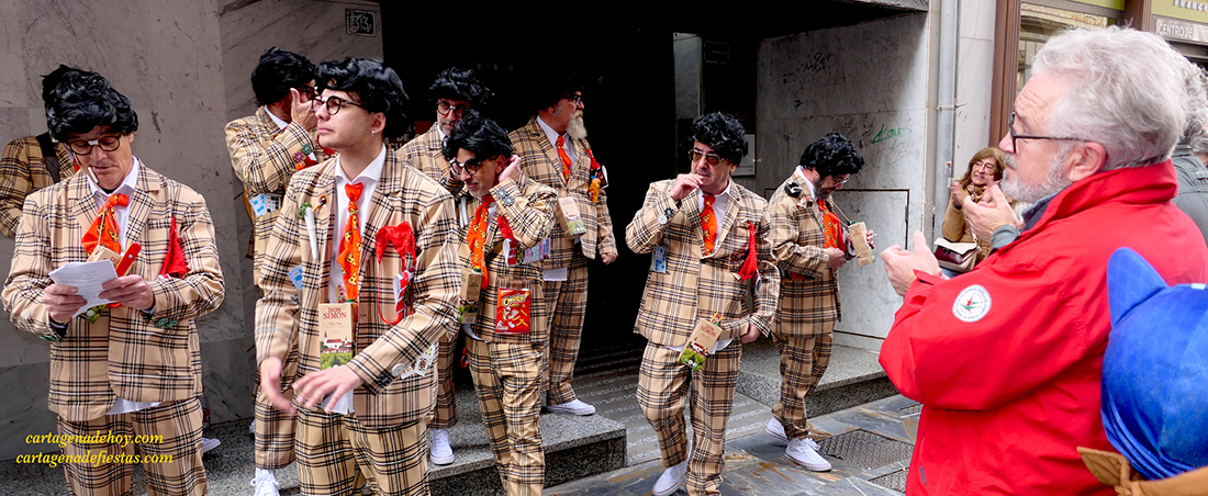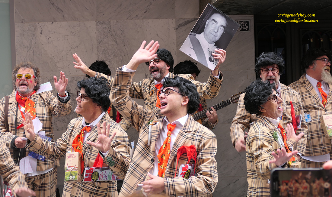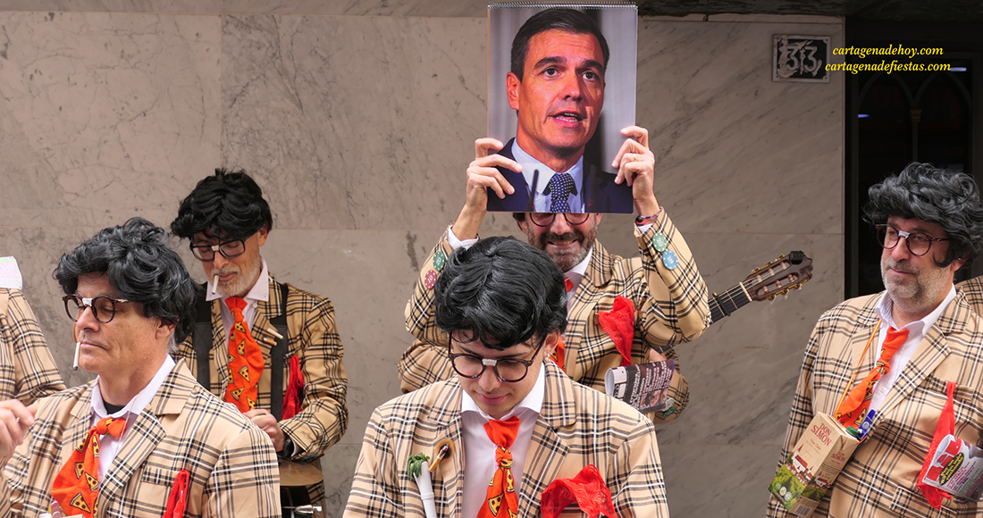 Con vestuario de ‘vividor’ (botes de cerveza vacíos colgando, bolsillos con cartones de bingo, varios cigarrillos… y el ‘kazoo’ o silbato adaptado a un cartón de Don Simón), lanzaron muchas puyas, culminando el popurrí con el apartado ‘Lo dejo cuando quiera’, en la que mostraron fotos de conocidos personajes de diferentes épocas y los relacionaron con estrofas adaptadas de conocidas canciones. Comenzaron con Pablo Casado y Teodoro García, del PP (“lo nuestro duró, lo que dos peces de hielo..”) y continuaron Carrero Blanco (“vuela, vuela…”), Ortega Lara (“solo en mi habitación…”), Pedro Sánchez (“lo estoy haciendo muy bien, muy bien…”), Pablo Echenique (“hoy no me puedo levantar…”), Alberto Garzón, Jaime de Marichalar y, entre otros, siendo el único político cartagenero de esa relación, José López, de MC, al que adjudicaron un conocido tema de Antonio Flores: “prometo ver la alegría, escarmentar de la experiencia y nunca más usar la violencia…”.