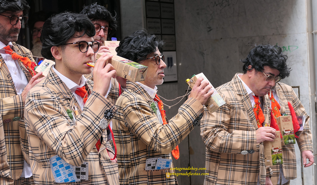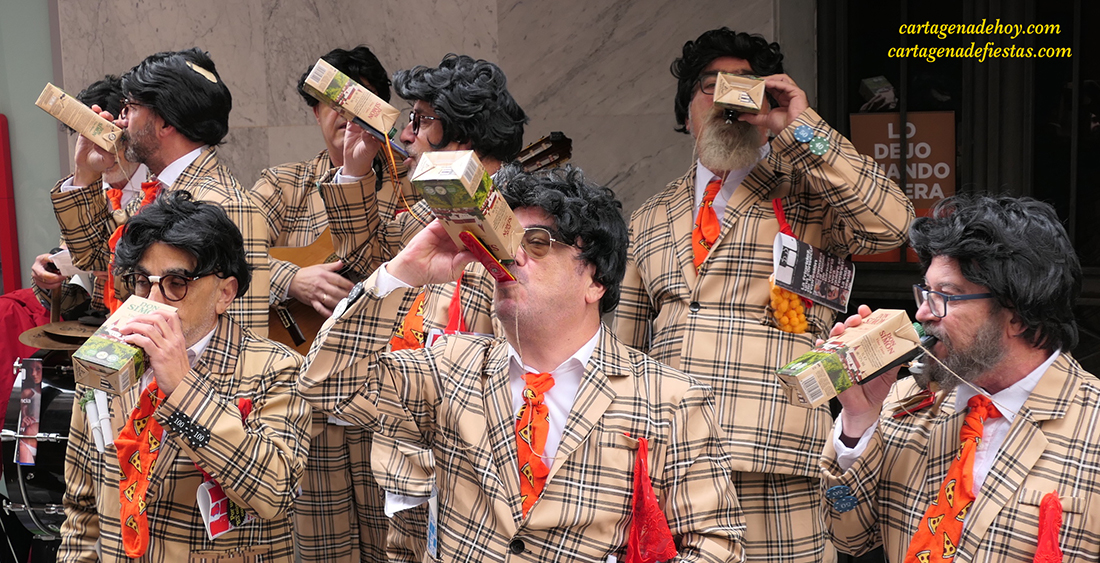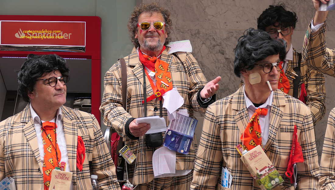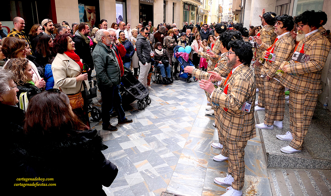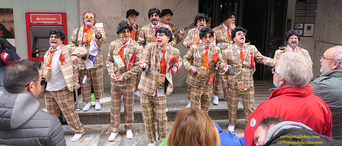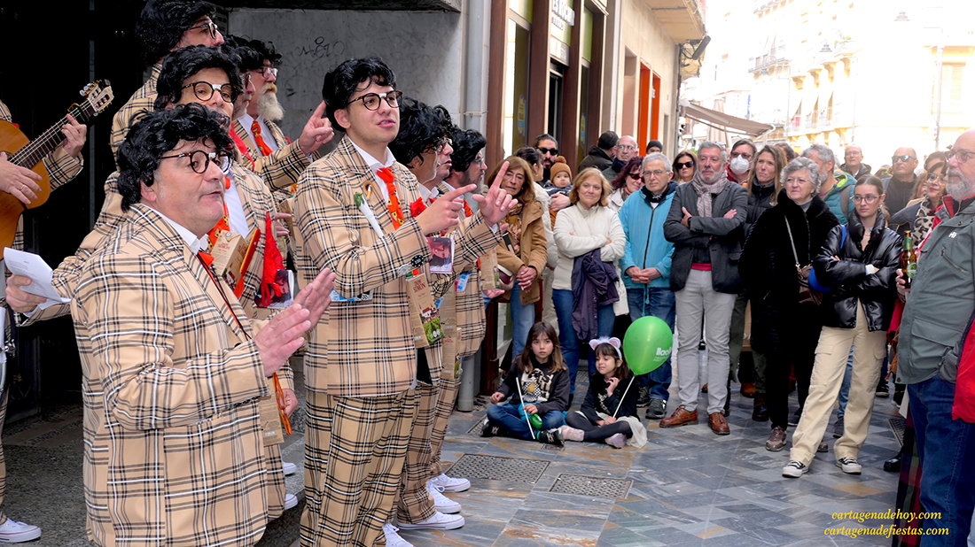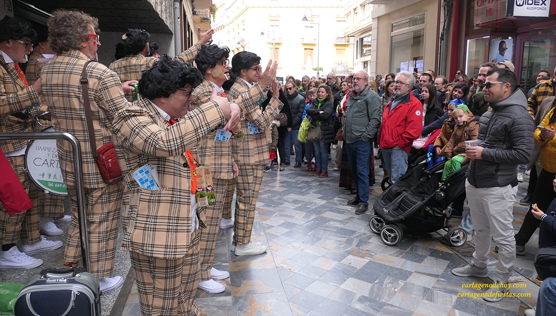 ‘Los singuangos’, con más de tres décadas de historia, siguen demostrando en la calle su calidad en las coplas burlescas, ahora con total libertad, pues no hay riesgos de ser ‘castigados’ por el jurado. Han actuado en diferentes puntos del centro, siendo Cartagena de Fiestas (Cartagena de hoy) testigo de cuando lo hicieron en la entrada a la calle Mayor por la plaza de San Sebastián. Enseguida contaron con numerosos viandantes como espectadores, arrancando constantes risas y sonrisas.