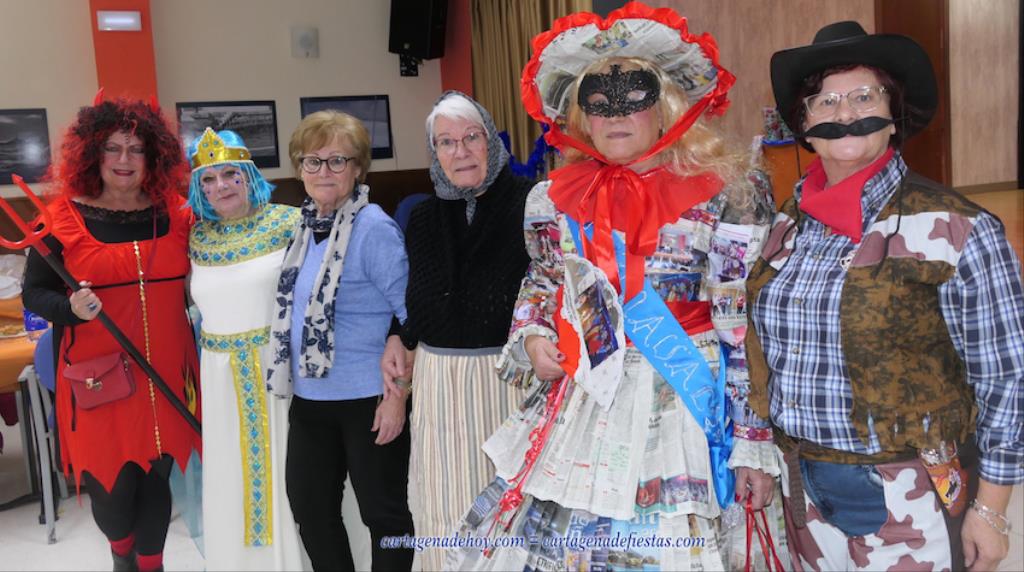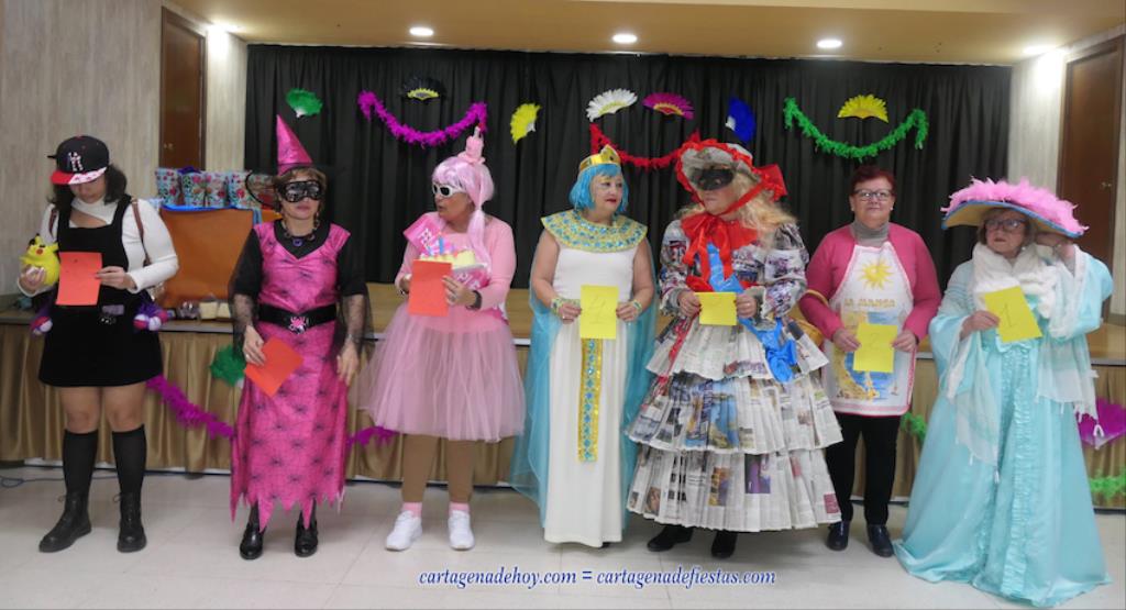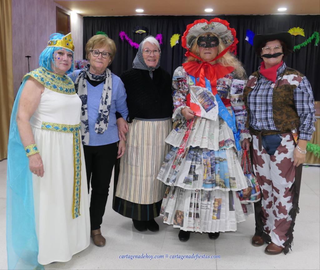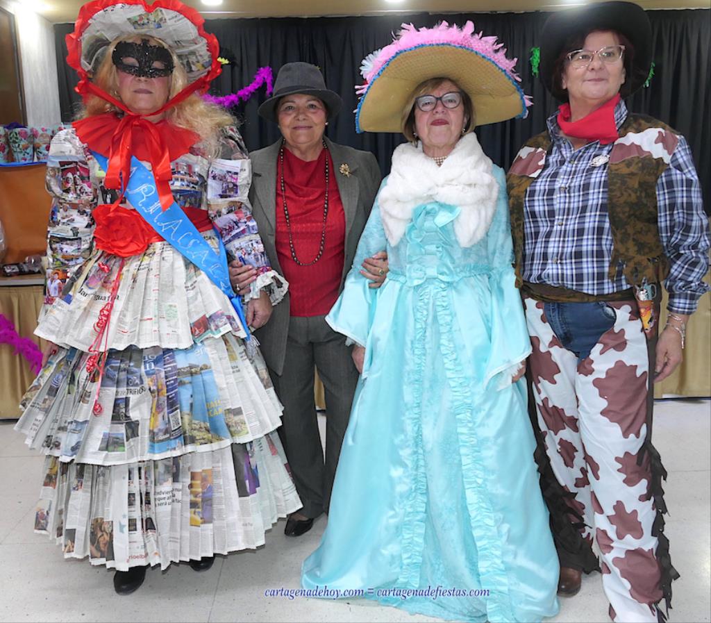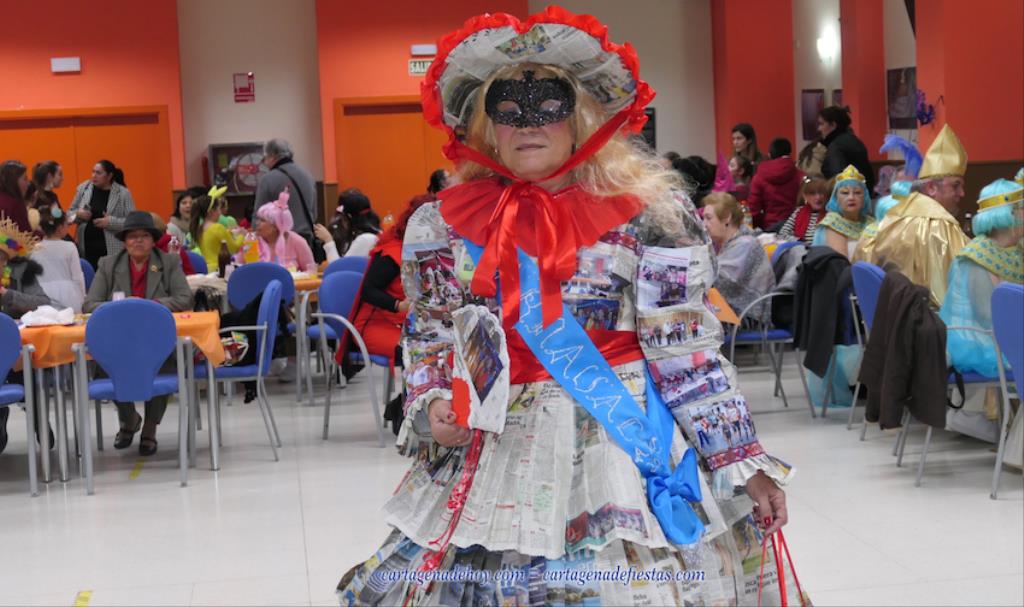 Lleva mucho trabajo preparar un disfraz como el creado por Veri García Furió para la fiesta de carnaval que tuvo lugar en el local social de Los Dolores. “He querido rendir homenaje a mis compañeras de la asociación y a las publicaciones de papel, tan castigadas desde la llegada de internet”, indicaba a Cartagena de Hoy (Cartagena de Fiestas) luciendo un traje (incluido el abanico) elaborado con hojas de los periódicos La Verdad, La Opinión y As, además de la (desaparecida) revista El Puente de Cartagena Norte, de donde sacó las fotografías de sus compañeras del colectivo femenino Cartagonova.