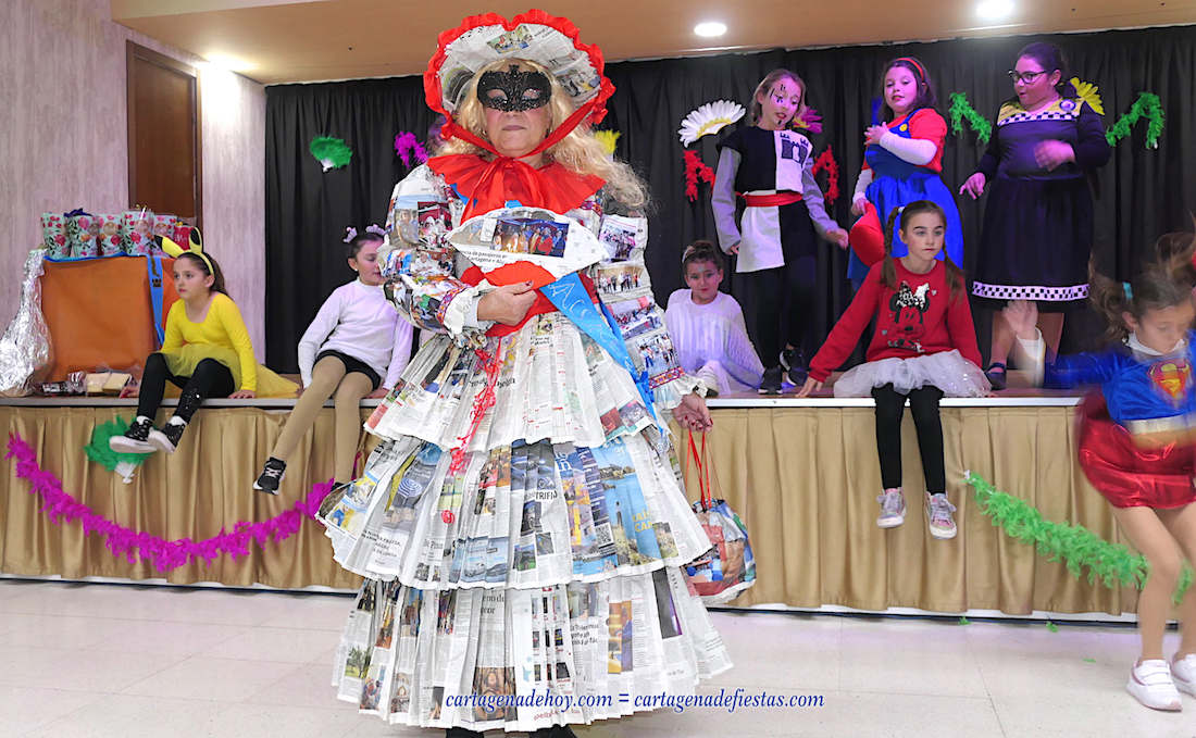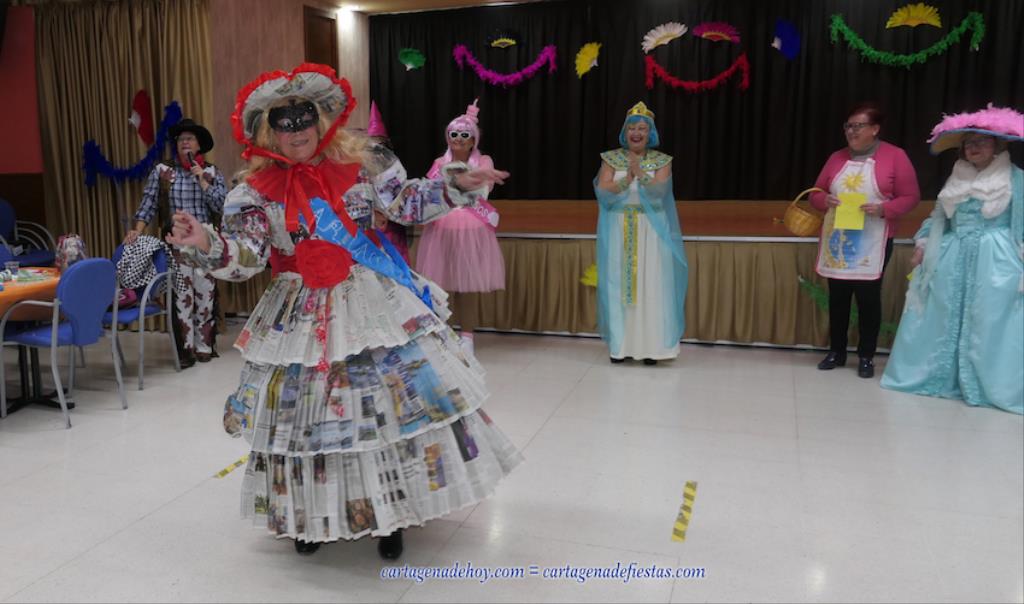 Veri García Furió quiso rendir homenaje con ese singular vestido a las publicaciones de papel y a sus compañeras de la asociación de mujeres Cartagonova, colectivo organizador de una animada fiesta que contó con la presencia de los reyes del carnaval de mayores de Cartagena. GALERÍA DE FOTOS (pinchar aquí)