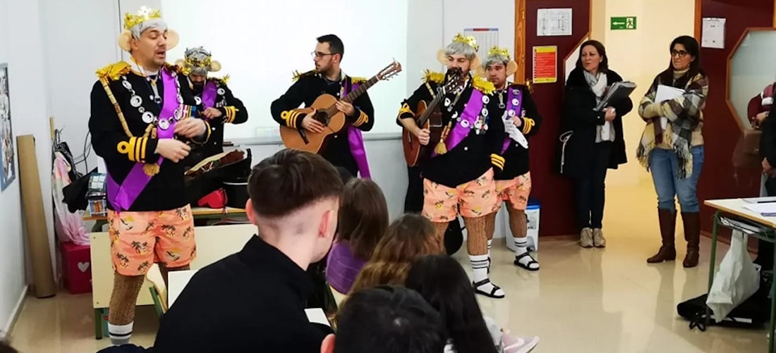 El grupo de 'Los de febrero' efectuaron una visita al colegio de La Vaguada para explicar a los escolares qué es el carnaval y qué son las chirigotas.