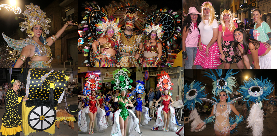'Aporue' de Santa Ana, 'Hondonada' de El Algar, 'Fantasía a color' de El Llano del Beal, 'Marchositas' de Ensanche-Almarjal y 'Divertilandia' de Cuatro Santos, además del grupo de 'barbis' de 'Patín en fila', participaron con vestuarios de plumas y disfraces en el la multitudinaria cita de las Fiestas del Rosario.