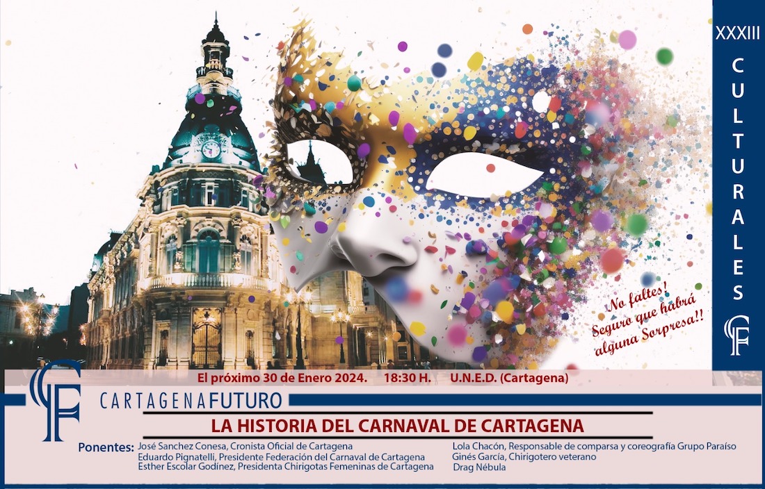 'Cartagena futuro', dentro de sus trigésimo terceras jornadas culturales, organiza hoy (18.30 horas) una conferencia en la sede de la UNED con presencia de cinco personas relacionadas con el mundo carnavalero de Cartagena y con el historiador José Sánchez Conesa, del equipo de cronistas oficiales de Cartagena.