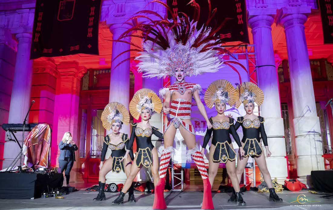 El programa para los tres primeros días de esta semana arranca esta noche con la octava edición del concurso nacional de ‘Drag-Queen’, que incluye la actuación de la cantante Natalia. El martes habrá pasacalles por el centro histórico y el miércoles se celebrará la gala benéfica para ayudar en su labor a Cruz Roja. En la foto, espectáculo ‘drag’ en la noche inaugural ante la fachada del Palacio Consistorial.