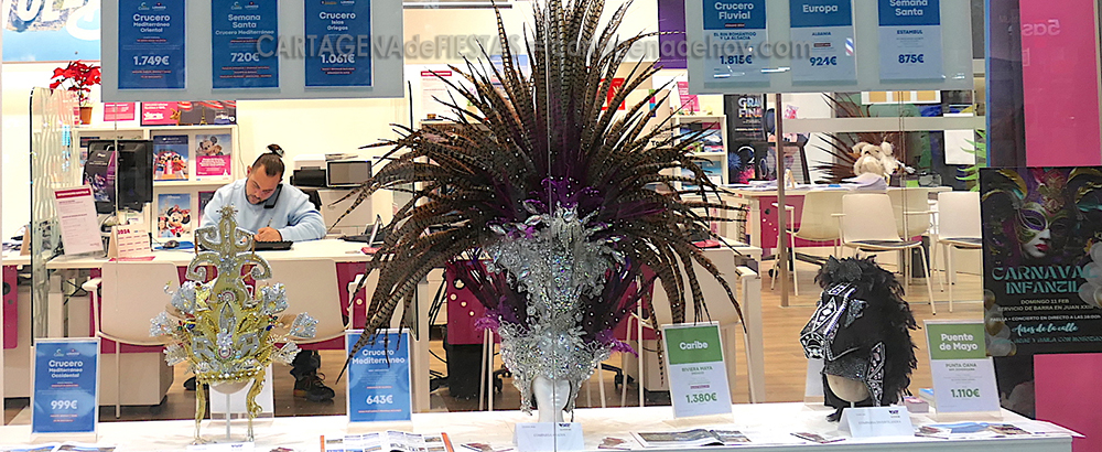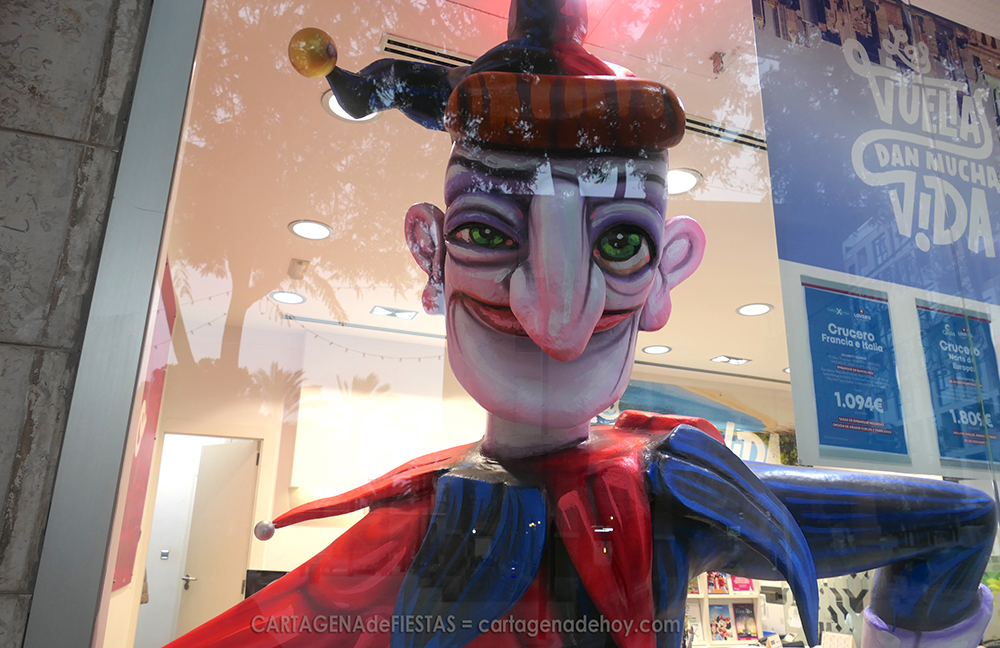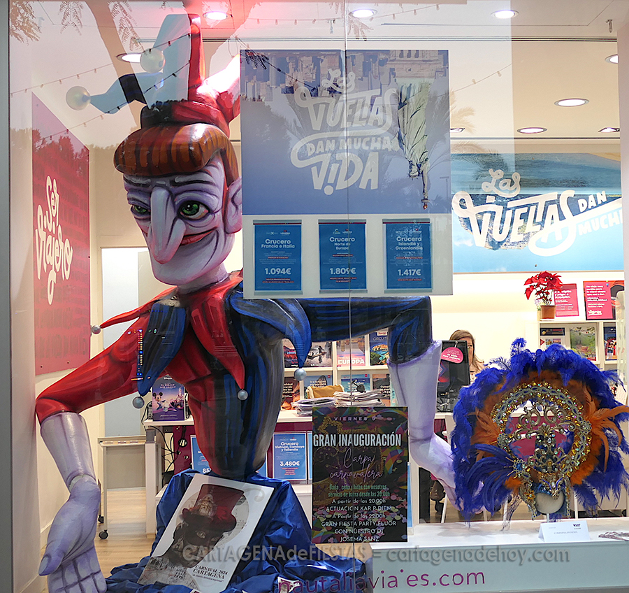 El nuevo muñeco que este año será quemado en el cierre del Carnaval de Cartagena, el próximo martes, se puede contemplar de cintura para arriba en el escaparate de una agencia de viajes de la plaza de Juan XXIII, donde también hay carteles y elementos de comparsas carnavaleras.
