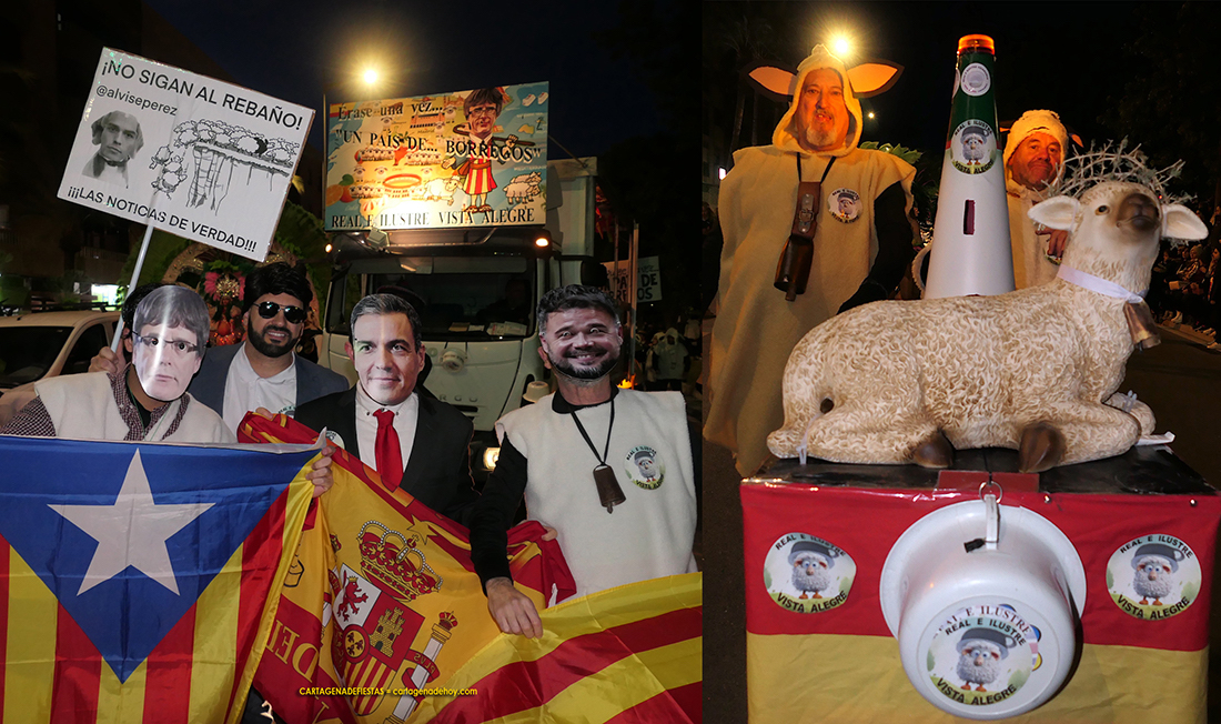 La comparsa crítica de Vista Alegre eligió este año como temática que, políticamente, España estamos en ‘Un país de borregos’, parodiando en su presencia en el desfile del carnaval a Pedro Sánchez, Puigdemont, Rufián… Lo curioso es que eligieron este tema antes de conocerse que el controvertido (y muy popular) cartel de la Semana Santa de Cartagena llevaba un borrego como imagen principal, “lo que nos vino genial”, indican, pues ampliaron su puesta en escena dando forma, con faro incluido, a lo que plasma la imagen.