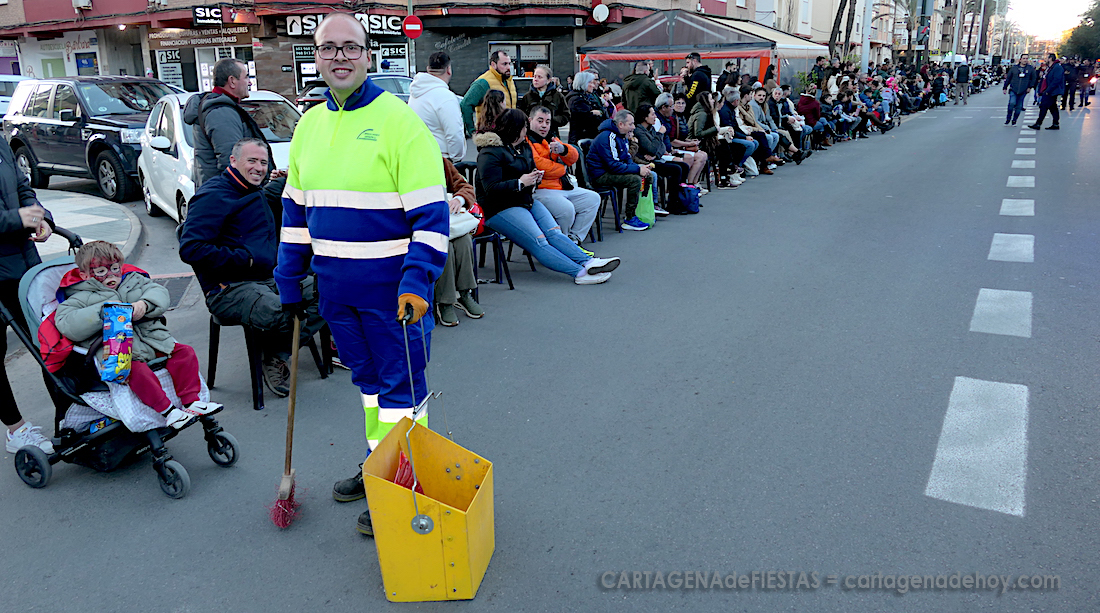 La fiesta cartagenera tiene unos ‘grupos extras’ en torno a comparsas, chirigotas y demás participantes, como es el equipo de limpieza de Lhicarsa, que se multiplica estas fechas para que la ciudad ofrezca un buen aspecto en este terreno y no se acumule la basura en sus calles, como se observa en la fotografía tomada cuando iba a comenzar el gran pasacalles de dos mil carnavaleros y que atrajo a miles de espectadores.