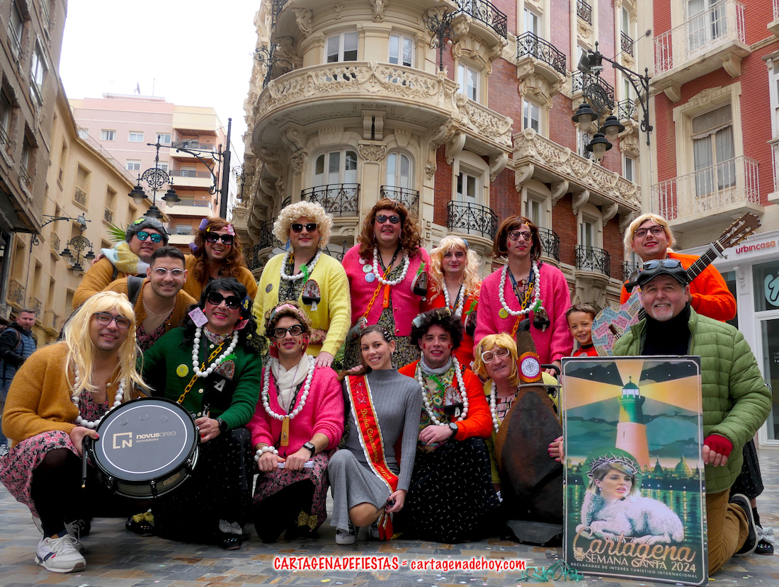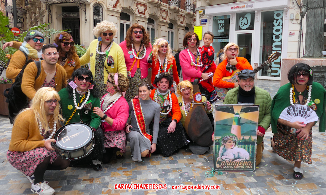 El grupo cartagenero ha participado en las chirigotas callejeras por vez primera como vencedor del concurso regional del Carnaval de Cartagena como su caracterización de 'maduritas' simpáticas y 'bordesicas'. En la foto, en la plaza de San Sebastián.