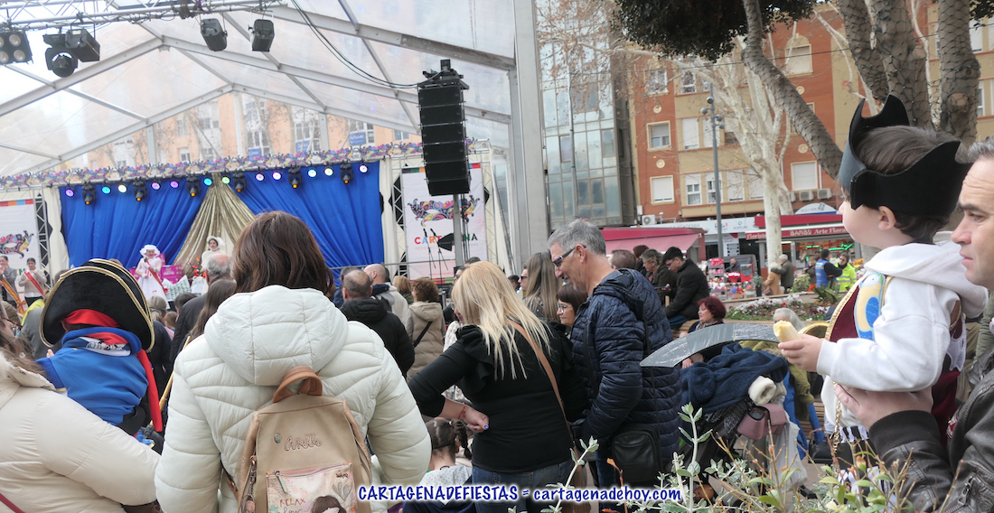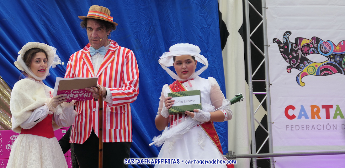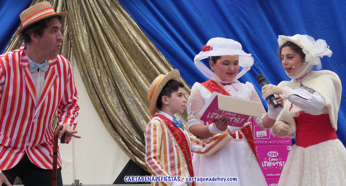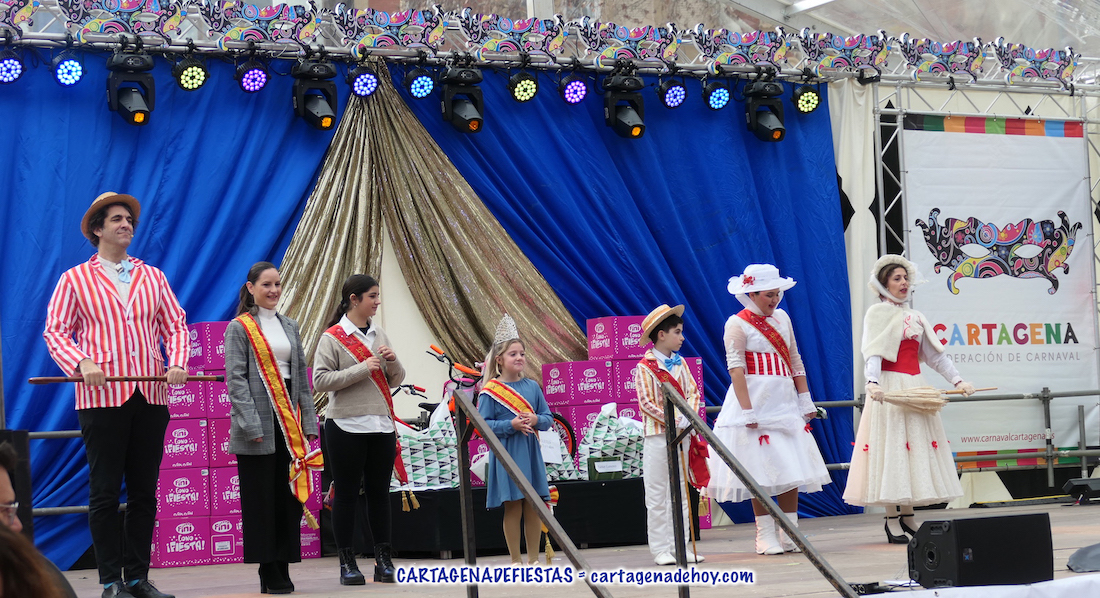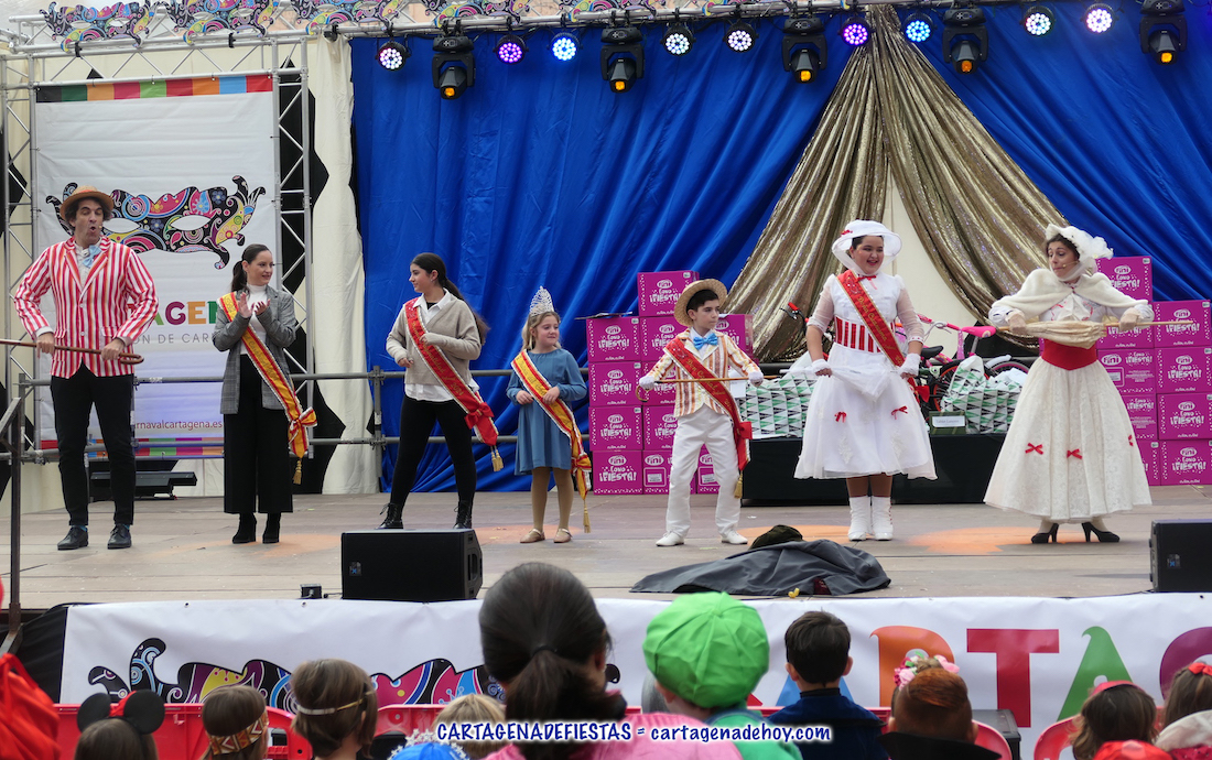 La carpa de la plaza de Juan XXIII se estrenó como marco del popular certamen en el que la lució la gran imaginación y variedad en los representaciones de los chavales. El acto fue presentado por Don Carnal y Doña Cuaresma infantiles y actores de la compañía Ditirambo representando personajes de Mary Poppins.