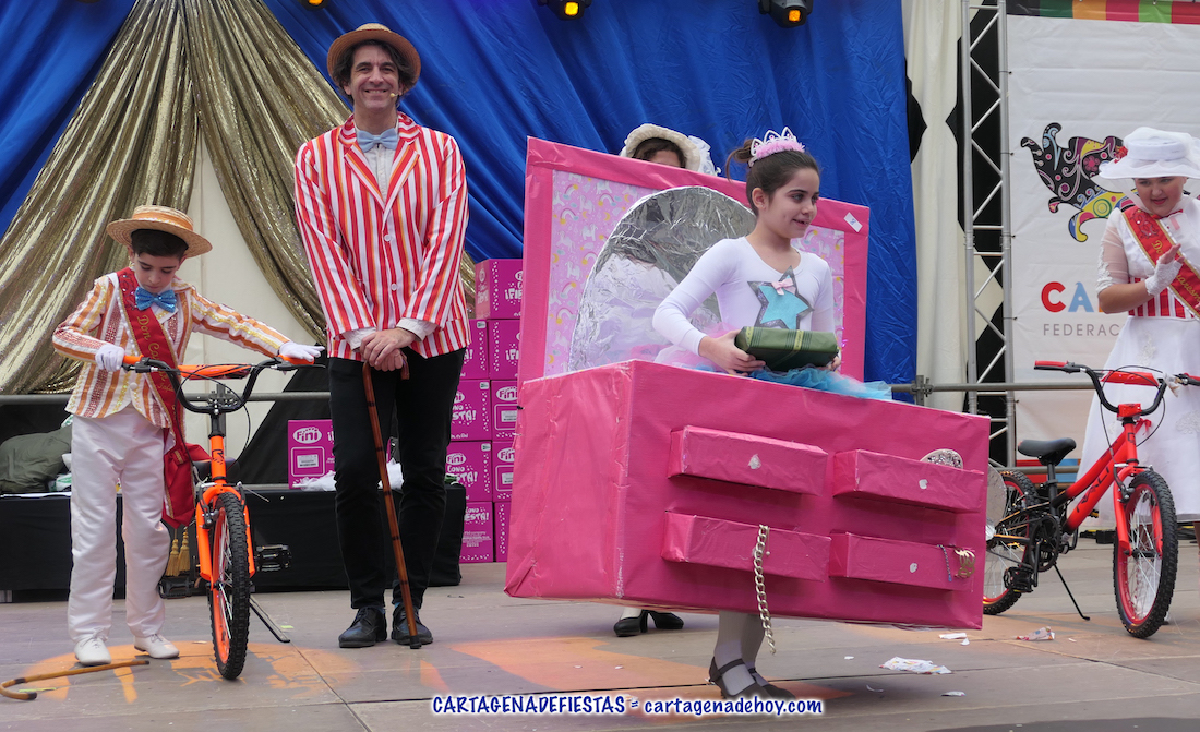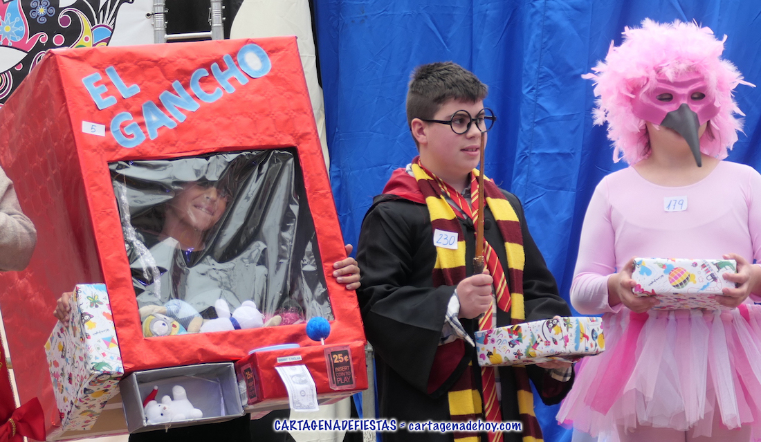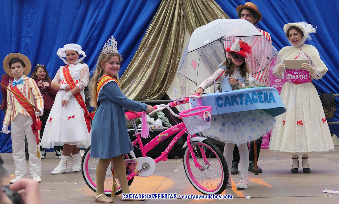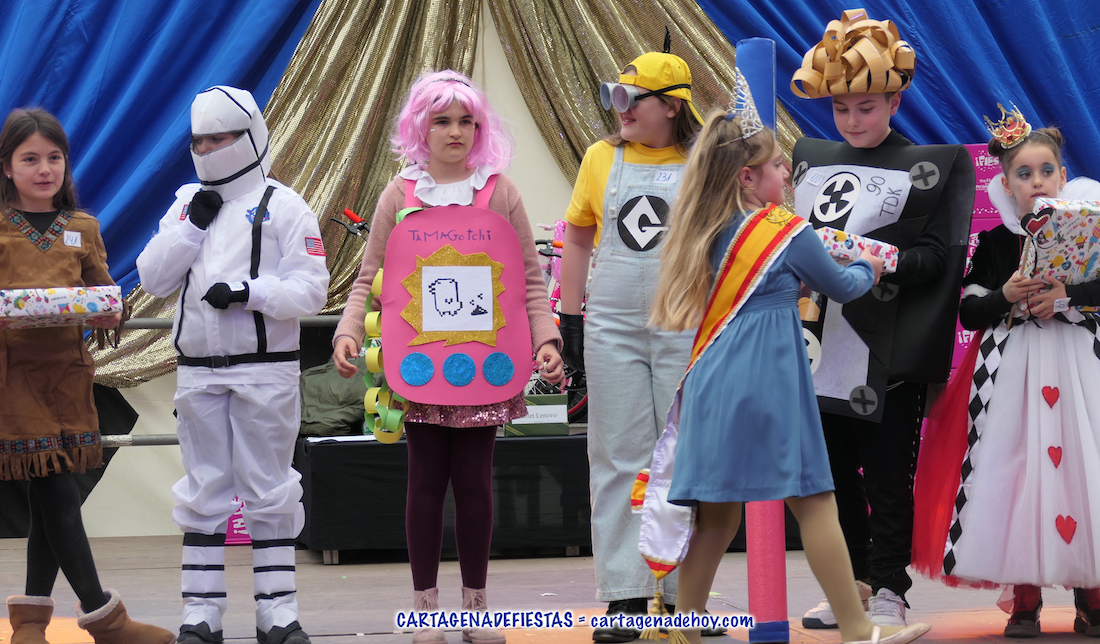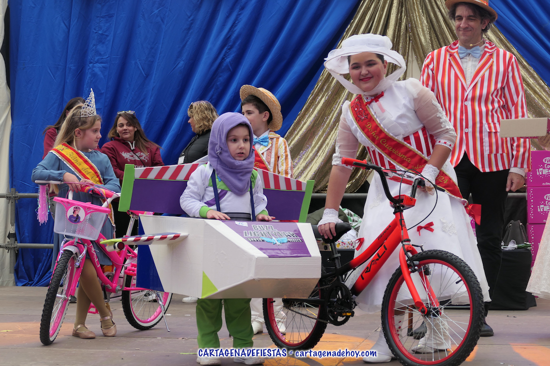 El jurado eligió como ganadores de las tabletas electrónica a los niños que lucía vestuarios del mundo del circo y de bailarina en caja de música, mientras que se llevaron bicicletas la chica que emulaba a un tensiómetro, un pequeño 'Buzz Lightyear' de la película 'Toy Story' y la chica que lució una réplica del cartel de la Semana Santa de Cartagena 2024, motivo por el que ofrecemos una artículo individual en el periódico de Cartagena y su gente.