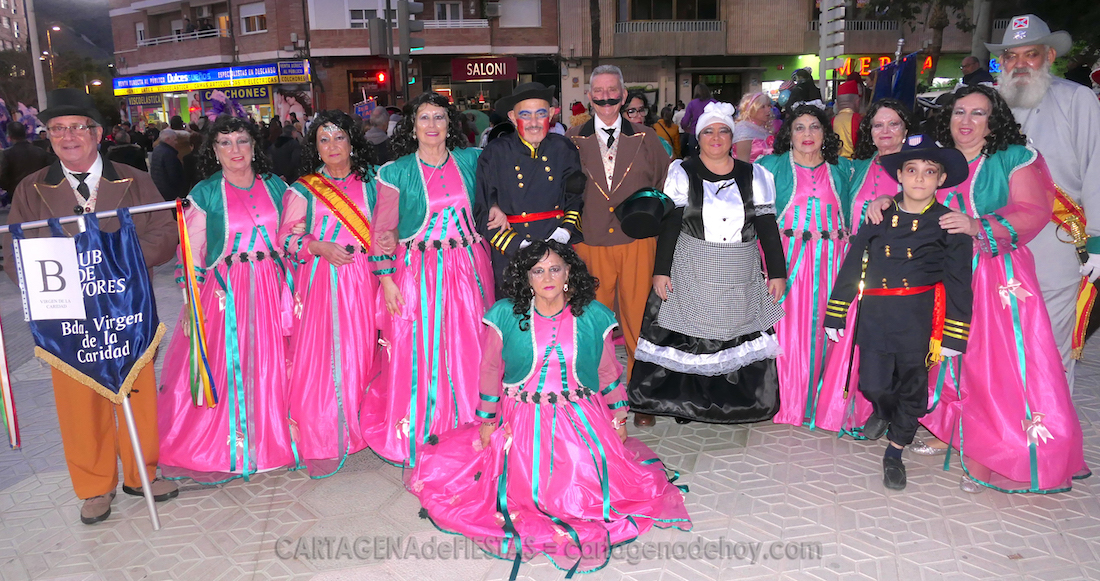 Componentes del grupo de mayores de la Barriada de Virgen de la Caridad de Cartagena que participaron en el desfile del Carnaval de Cartagena’24 con disfraces de la legendaria película ‘Lo que el viento se llevó’.