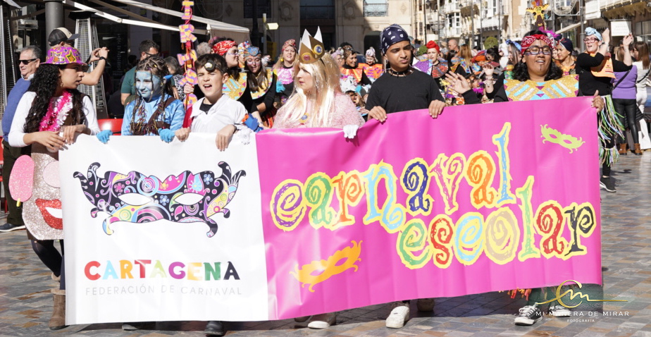 Las calles de Cartagena se han llenado en la mañana de este martes 13 de febrero de alegría con el desfile del Carnaval escolar, un pasacalles en el que han participado alumnos de ocho centros educativos. Ha arrancado a las 11:00 horas en la Plaza Juan XXIII, epicentro de estas fiestas, y ha terminado en la Plaza del Ayuntamiento tras recorrer las principales calles del centro de la ciudad.