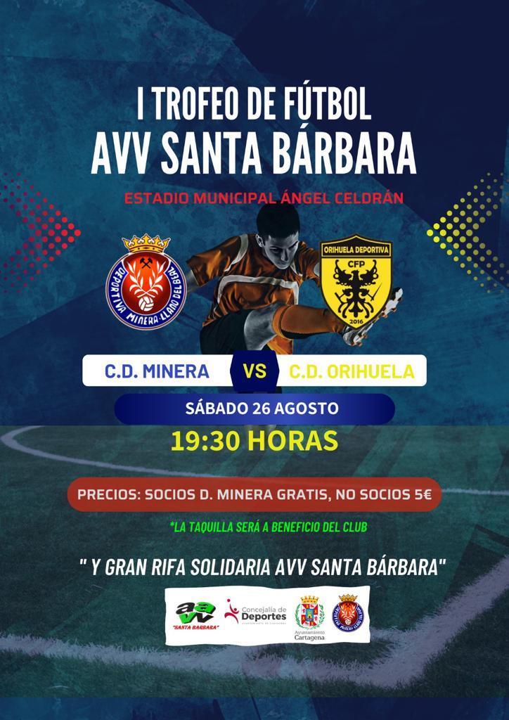 Deportiva Minera y CD Orihuela disputan esta tarde, a las 19.30 horas en el campo Ángel Celdrán de El Llano del Beal, la primera edición del torneo estival de la Asociación de Vecinos Santa Bárbara. Entrada gratis para los socios y a 5 euros para el resto.