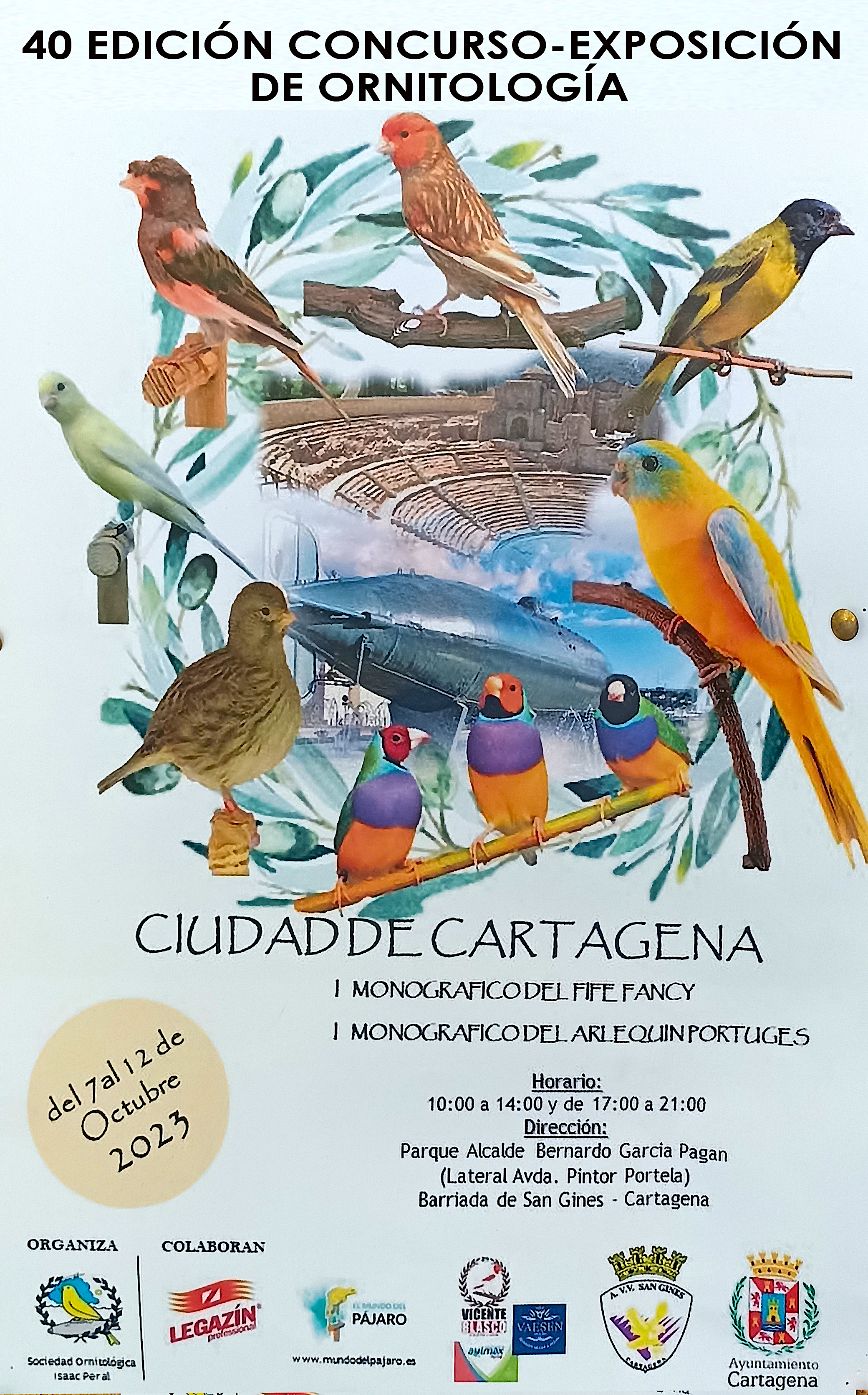 Organizado por la Sociedad Ornitológica Isaac Peral, del 7 al 12 de ese mes se celebrará una nueva edición del concurso-exposición de ornitología en horario de mañana y tarde en el parque Alcalde Bernardo García Pagán de la barriada de San Ginés de Cartagena. Incluirá los primeros monográficos de ‘Fife Fancy’ y del ‘arlequín portugués’.
