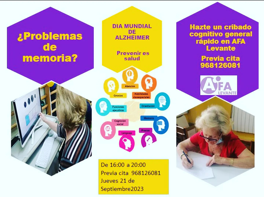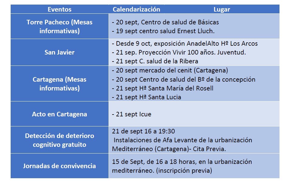 El 21 de septiembre se celebra cada año el 'Día mundial del Alzheimer', motivo por el que la asociación de familiares d epersonas con enfermedades neurodegenerativas y prevención del envejecimiento patológico ultima una serie de actividades para este día. El objetivo es mejorar la concienciación ante la enfermedad y conmemorar el esfuerzo de los familiares, cuidadores y pacientes. Entre las distintas actividades se encuentran mesas informativas, charla-coloquio, taller creativo en jornadas de convivencia, detección de deterioro cognitivo gratuito, etc.