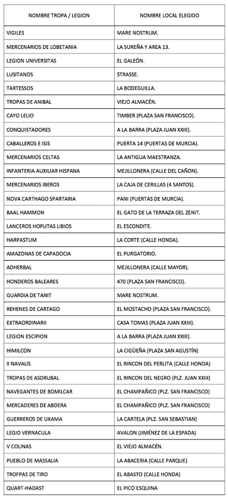 La política de pactos que inició el cartaginés Asdrúbal 'El potro de Cartago' cuando fundó Qart-Hadast continúa en el tiempo. Un ejemplo es que la gran mayoría de grupos festeros han llegado a acuerdos con bares y cafeterías del centro histórico, siendo los más alejados Legio Vernácula en Jiménez de la Espada y Tropa de Baal-Hammon en la terraza del Cénit. Con estos pactos, los locales garantizan el ambiente durante estas fechas y los festeros disponen de consumisiones a precio más módico. Ofrecemos la relación detalladas de todas las ubicaciones.