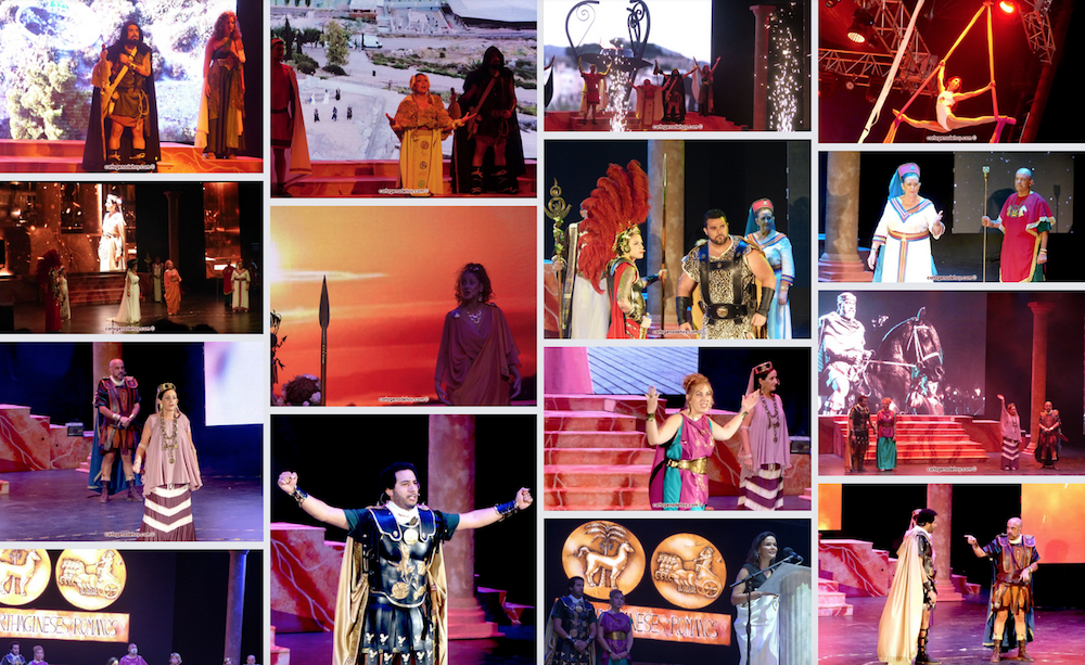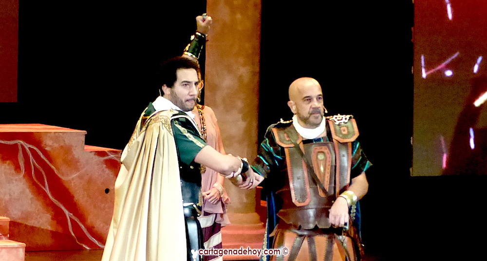 Una introducción con voz en off acompañada por la música de la película ‘Gladiator’ (demasiado manida en estas fiestas cuando resulta que hay temas originales propios) daba paso a una pareja que ofrecía sus acrobacias antes de que irrumpieran en el escenario los dioses púnicos y romanos, quienes protagonizaron la primera disputa entre ambos bandos de esta edición, para después centrarse en una alegoría sobre la ciudad que tomó forma de mujer, siendo destinada ser “un brillo eterno en la eternidad” con el apoyo de los dioses para alcanzar la gloria.