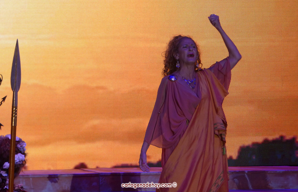 Las dos llamas se fundieron en una que encendieron el pebetero del Castillo de la Concepción, para después desplegarse la puesta en escena del arranque de la XXXII edición con representaciones y proyecciones que iban dando al gran ejército de época que hay detrás de Carthagineses y Romanos, que lanza un mensaje muy expresivo: “Hemos vuelto”. En la imagen, la alegoría de la ciudad.