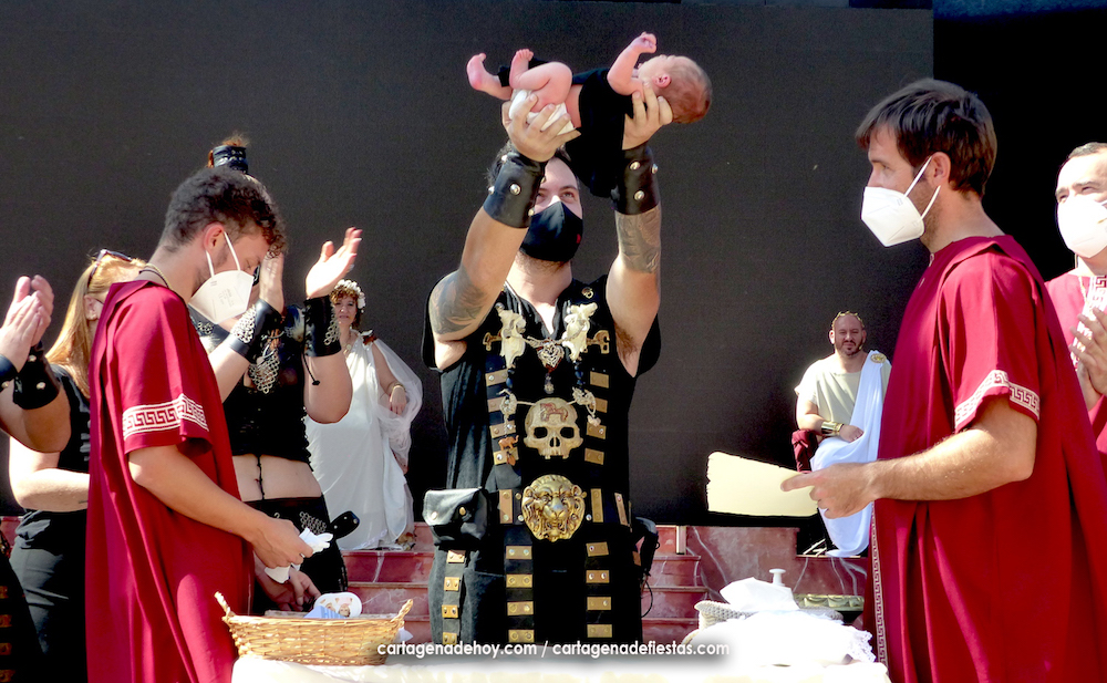 Por el altar han pasado una veintena de niños romanos (y alguno carthaginés), cifra máxima autorizada este año por motivos sociosanitarios debido a la situación pandémica. Las familias de los pequeños (algunos de cortísimo tiempo de vida) de este ‘Dies Lustricus’ (antes ‘Nasciturus’) de Carthagineses y Romanos han entregado cestas de frutas que tendrán como destinos entidades benéficas de Cartagena.