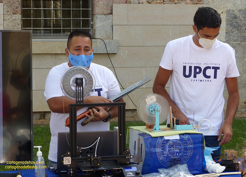 La elaboración de una gladio y una falcata mediante impresión tridimensional ha sido uno de los atractivos principales de las acciones de divulgación científica y concienciación medioambiental que la UPCT ha organizado hoy en la plaza del CIM, con motivo de la semana de la ‘Noche europea de la investigación’ y vinculadas con las fiestas de Carthagineses y Romanos. Esta actividad ha permitido conocer como se inicia el proceso aprovechando plásticos inservibles, que son reciclados, para después generar unos filamentos que serán el componente de la modelación.