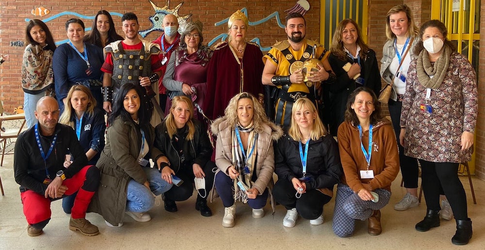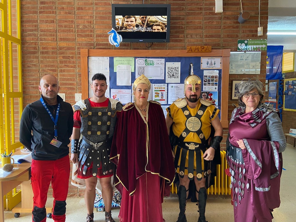 El grupo de voluntarios del área de relaciones externas de la Federación de Tropas y Legiones sigue su ruta por los centros docentes de nuestro municipio, siendo la última escala la que tuvo como marco este centro docente, donde promocionaron las fistas entre el alumnado y profesores, entre los que se encontraba una doce procedente de Francia, Polonia, Grecia y Letonia.
