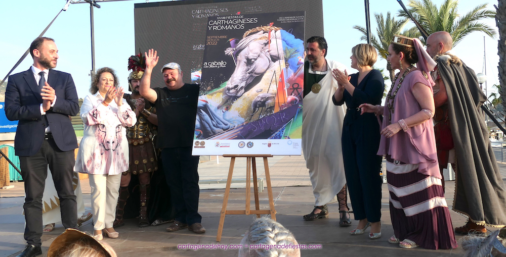Después ha sido invitado a hacer uso en público de l a palabra el director de Calidad y Competitividad de la Comunidad Autónoma, Carlos Peñafiel, quien se ha referido a las fiestas diciendo que llena Cartagena "de luz, color y sabor". Le ha sucedido la alcaldesa de Cartagena, Noelia Arroyo, recién llegada de A Coruña. "Tras el año de la tregua y el año de actos contenidos, hay muchas ganas de disfrutar las fiestas por todo lo alto, como nos tenéis acostumbrados los festeros", ha comenzado diciendo, para después referirse al proyecto ya en marcha de la Hispana Romana como destino turístico, "en el que carthagineses y romanos tenéis mucho que ver", cerrando con elogio al cartel de "un gran dibujenta que transmite sensaciones". En el escenario también han estado presente los personajes de Aníbal, Escipión, Himilce y Emilia Paula.