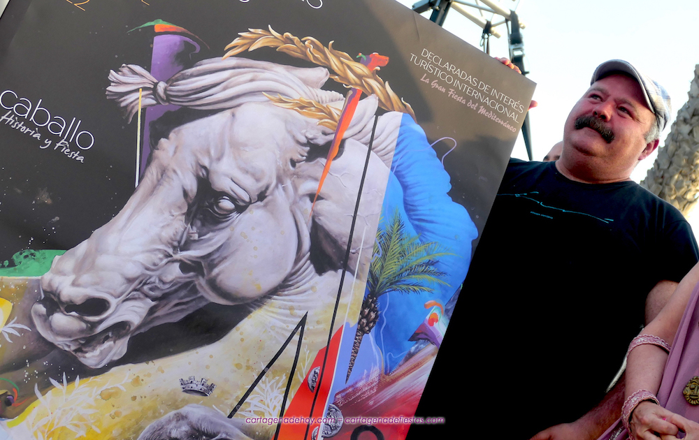 Tras la proyección de un vídeo con escenas captadas durante la elaboración del cartel, Kraser ha explicado que ha elegido como "imagen central al caballo, pues es común en los símbolos de carthagineses y de romanos, además de por su valor histórico", completando la escena con otro elementos de referencia de ambos bandos y con la leyenda: 'A caballo entre historia y fiesta'. Por cierto, que Kraser estuvo ayer efectuando un mural junto al Domus del Pórtico, labor que interrumpió para este acto.