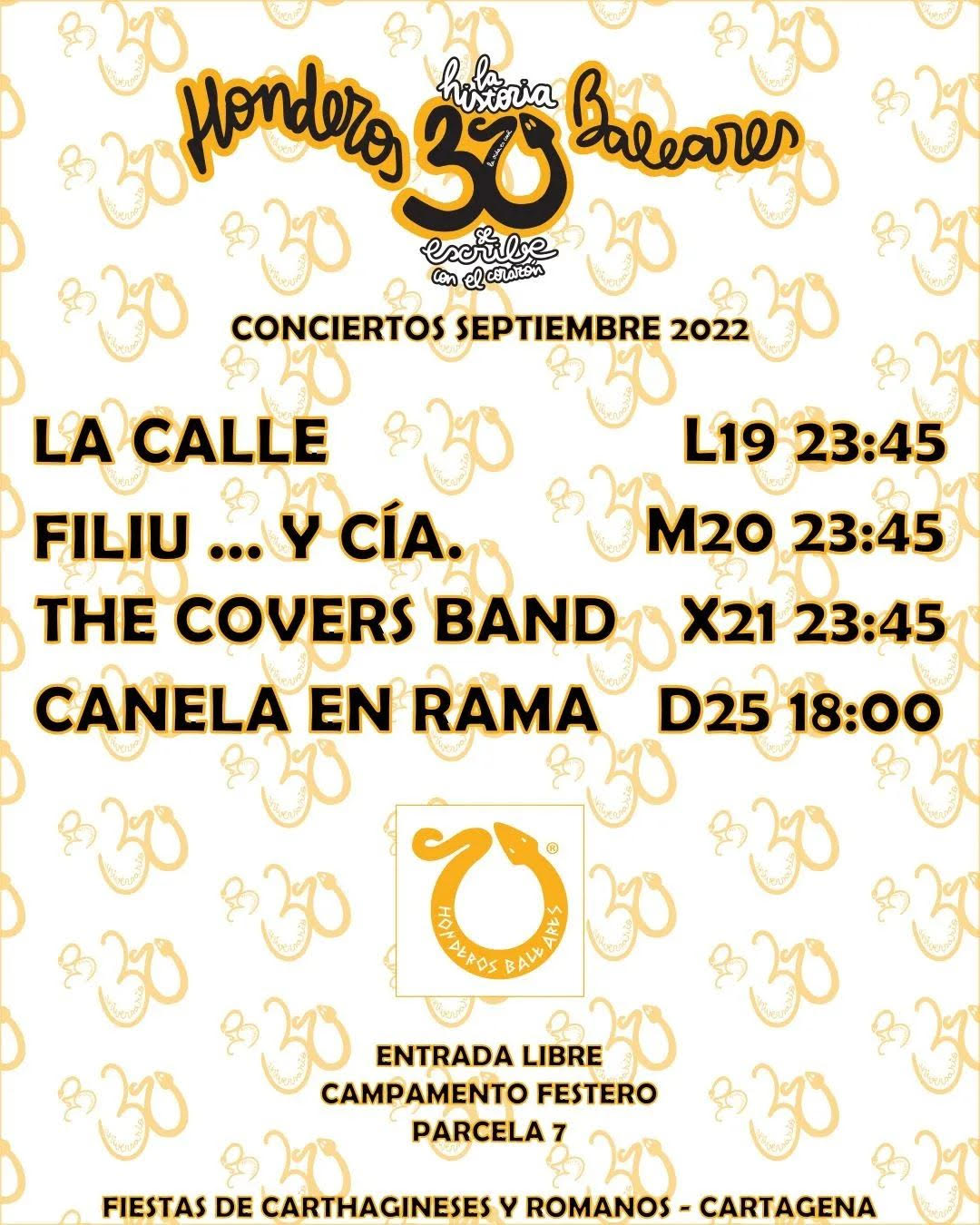 La tropa de carthagineses Honderos Baleares, dentro de su 30 aniversario, ha programado cuatro actuaciones musicales para su recinto de la gran aldea de Carthagineses y Romanos. Las actuaciones correrán a cargo de La Calle, Filiu y Cía, The Covers Band y Canela en Rama los días 19, 20,21 y 25 de septiembre. La entrada será gratuita y se celebrará en la parcela 7 del campamento festero.