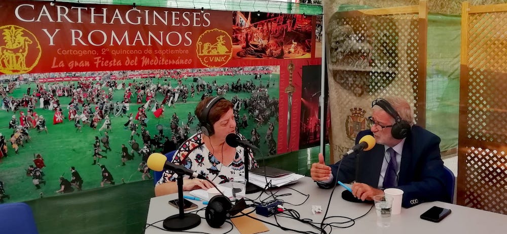 La emisora cartagenera, que este mes está realizando su programación matinal desde la gran aldea de Carthagineses y Romanos, se incorpora hoy a las noches con una programación especial que comienza a las 21 horas desde su carpa en la calle carthaginesa. En la imagen, la entrevista que ayer efectuó Chelo Cánovas en dicho lugar al presidente de la Asamblea Regional, Alberto Castillo.