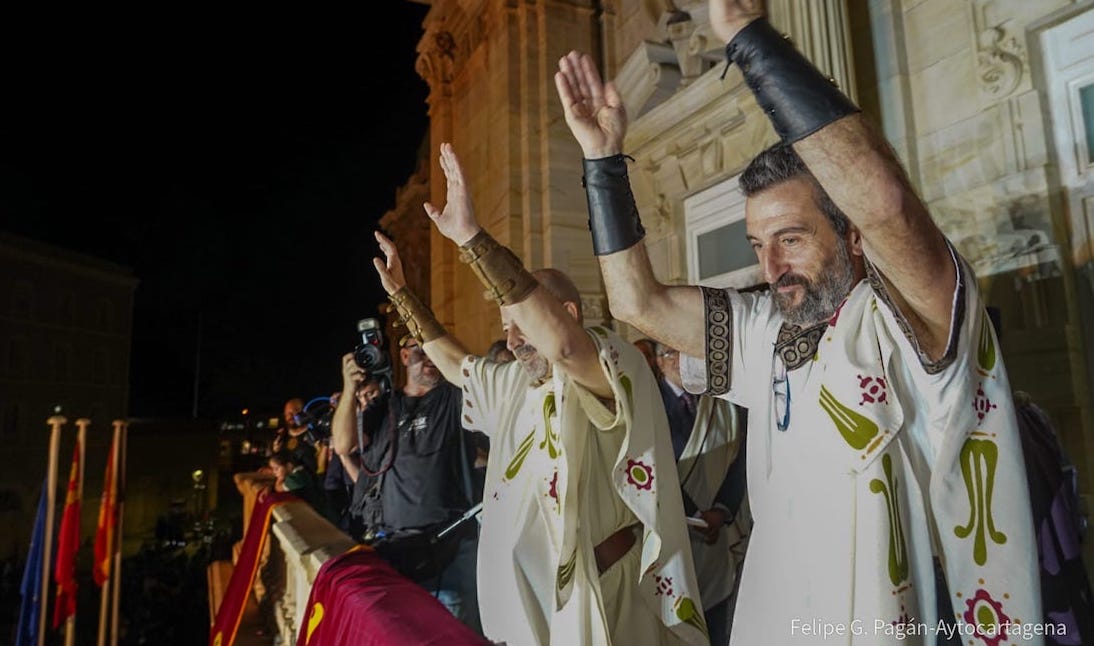 La historia de Cartagena cobra vida de nuevo con la XXXIII edición de las Fiestas de Carthagineses y Romanos, que vuelven a recrear la segunda Guerra Púnica tras dos años de ausencia por la pandemia. El pregón desde el Palacio Consistorial ha dado este viernes 16 de septiembre el pistoletazo de salida a diez días de fiesta. Los encargados de realizarlo ante cientos de cartageneros y visitantes han sido los actores Luis Zahera y Manuel Tallafé, que han estado acompañados en el balcón del consistorio con la alcaldesa, Noelia Arroyo y el presidente de la Federación de Tropas y Legiones, José Antonio Meca.