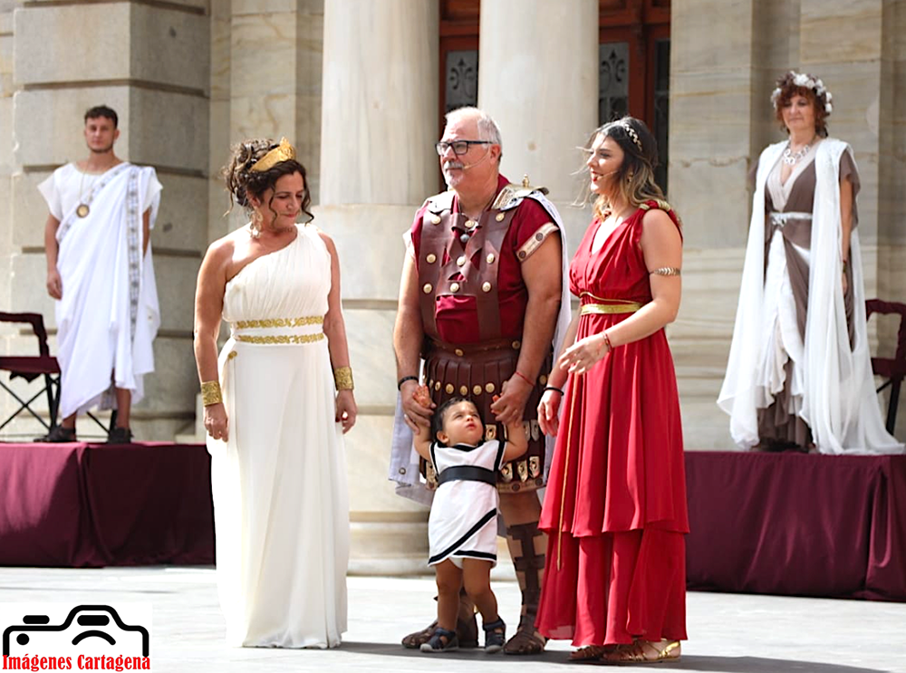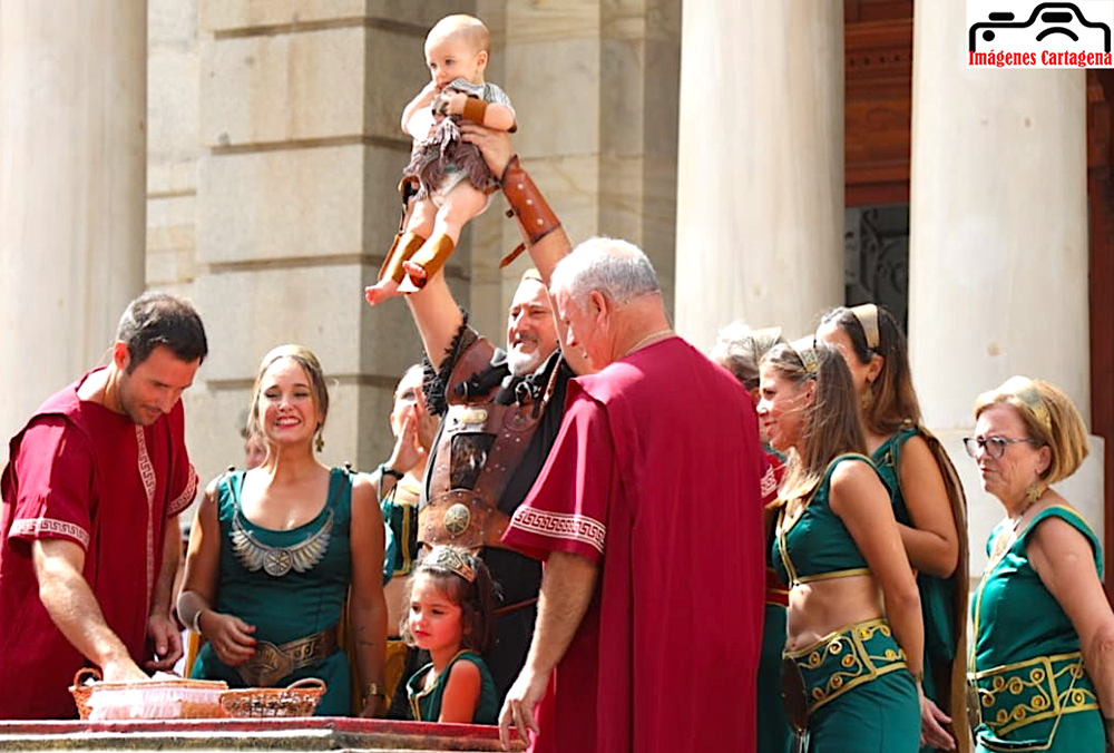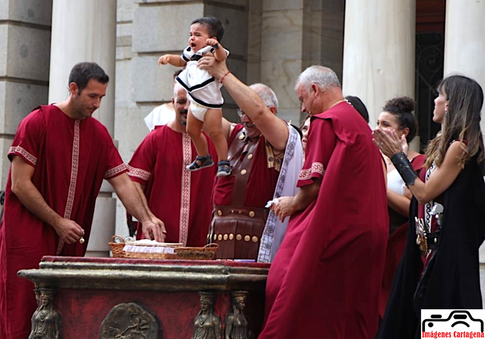 Tras un vistoso y soleado inicio con danzas y música épica, aparecen en el escenario la triada capitalina de dioses (Apolo, Juno y Jano,), ante los que se va efectuando el ritual de forma fidedigna a como sucedía en esta tierra en la Carthagonova romana. Los nuevos festeros de ambos bandos son bautizados al rito romano. Sus huellas son plasmadas en los diplomas conmemorativos y cada presencia culmina con los padres o abuelos elevando a los pequeños al cielo, hacia los dioses. También se le impone la ‘bulla’, amuleto con el que se alejaba el ‘mal de ojo’. Las familias de los chavales aportan alimentos, que después son llevados por la legión a entidades que acogen a personas desfavorecidas de nuestra sociedad.