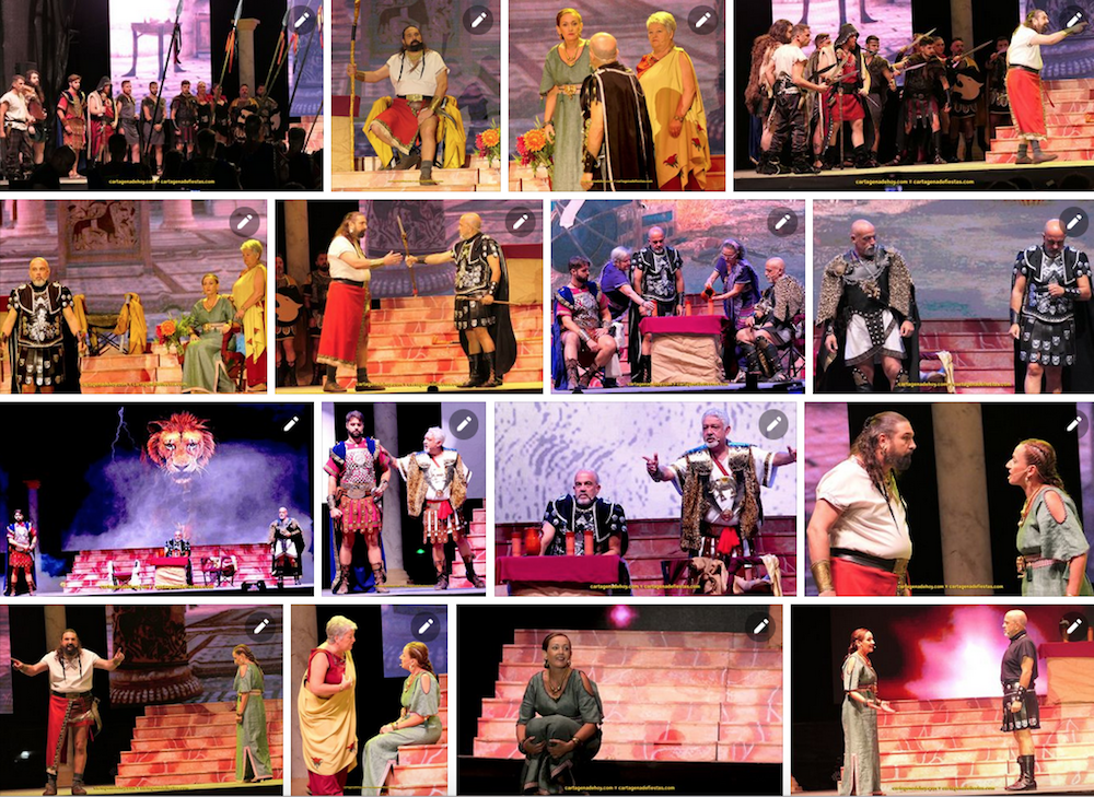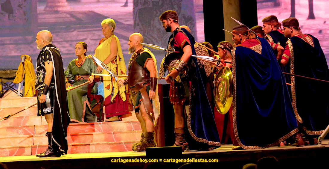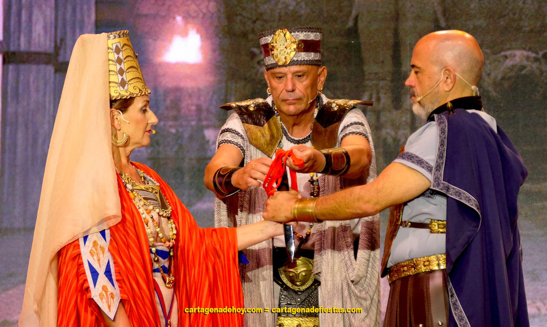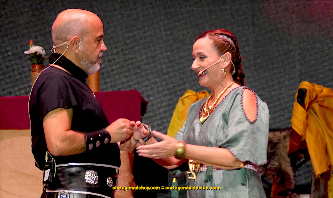 Durante la representación del pasaje en el que Aníbal e Himilce convierten en una historia de amor un pacto de estado, Víctor Nieto sorprendió a Carmen Pareja con un texto fuera de guión que culminó con la entrega de un anillo, momento en el que recoge la fotografía superior. Fue la ‘guinda’ romántica a una brillante puesta en escena que contemplaron dos mil personas y en se fijó el récord de besos entre el el estratega y la princesa. GALERÍA DE FOTOS (pinchar aquí)