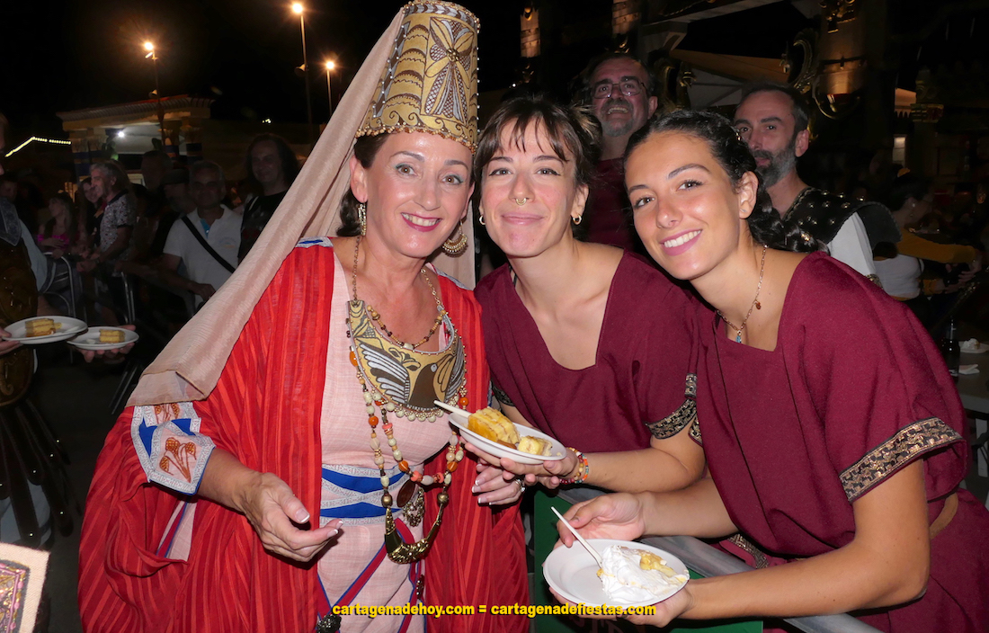 El campamento fue el lugar de celebración de la boda de Aníbal e Himilce, distribuyéndos entre festeros y visitantes varias tartas de merengue, además de los productos que ofrecieron varias tropas que acogían enlaces al rito púnico. GALERÍA DE FOTOS (pinchar aquí)