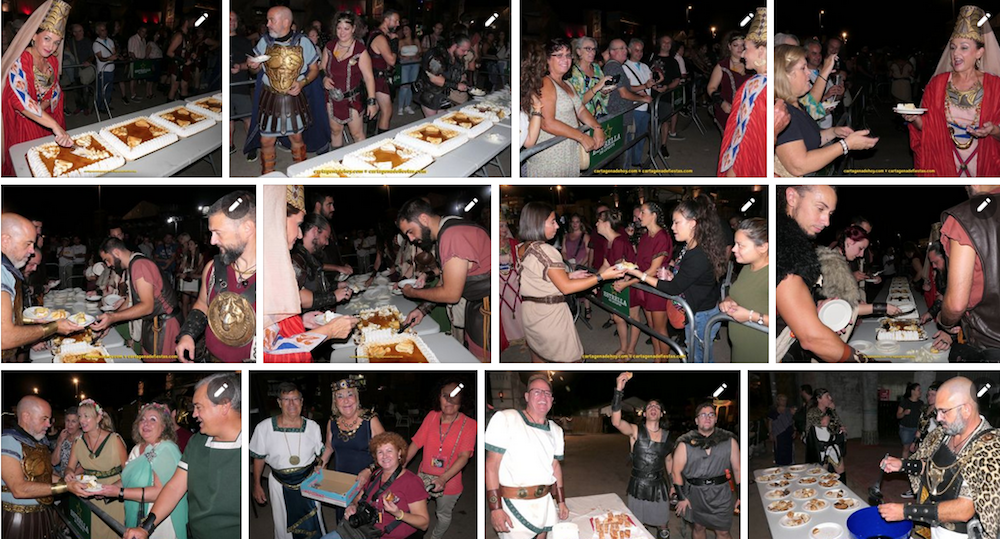 Además, la noche acogía la posibilidad de que festeros y visitantes pudieran contraer matrimonios por el rito púnico. En varios lugares, tras el enlace eran invitados a tarta, y en otros recintos se colocó una mesa en la fachada para ofrecer a los que anoche estaban en el campamento diversos ‘condumios’ y brebajes, como los bocadillos de sobrasada de Tanit o la ‘Ambrosía magona’ de Tropas de Magón, por poner unos ejemplos.
