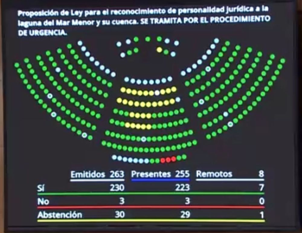 Los colectivos en defensa del Mar Menor manifiestan su satisfacción por el resultado de la aprobación definitiva (SI 230+223 = 453 votos en el Pleno del Senado ) de la ley que reconoce personalidad jurídica y dota de derechos propios al Mar Menor y su cuenca, tras convocar una concentración hoy día 21 de sept. frente al Senado, dónde han vivido en directo la votación.