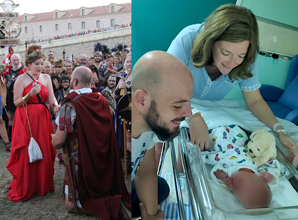 Juanjo le pidió la mano a Maloles tras terminar la gran batalla por Qart-Hadast de 2016. Ahora, seis años más tarde y también dentro de Carthagineses y Romanos, ha nacido Mario, comenzando a tener contracciones su madre (presidenta de la Legión de Sagunto) cuando el esposo estaba actuando en la obra de la ‘Destrucción de Sagunto’. La situación tuvo un final feliz con la llegada del pequeño y la curiosidad que ella dio a luz vestida de romana, vestuario que también lucía el padre en el paritorio. En las imágenes adjuntas, cuando tuvo lugar la propuesta de boda en el campo de batalla y la feliz pareja con su retoño en el hospital.