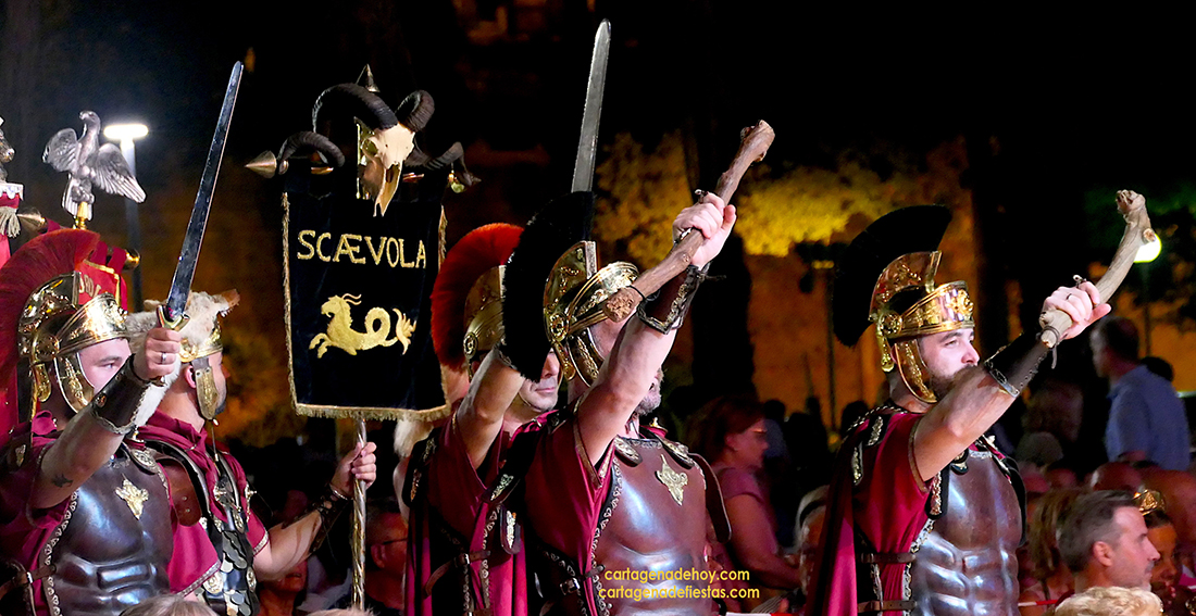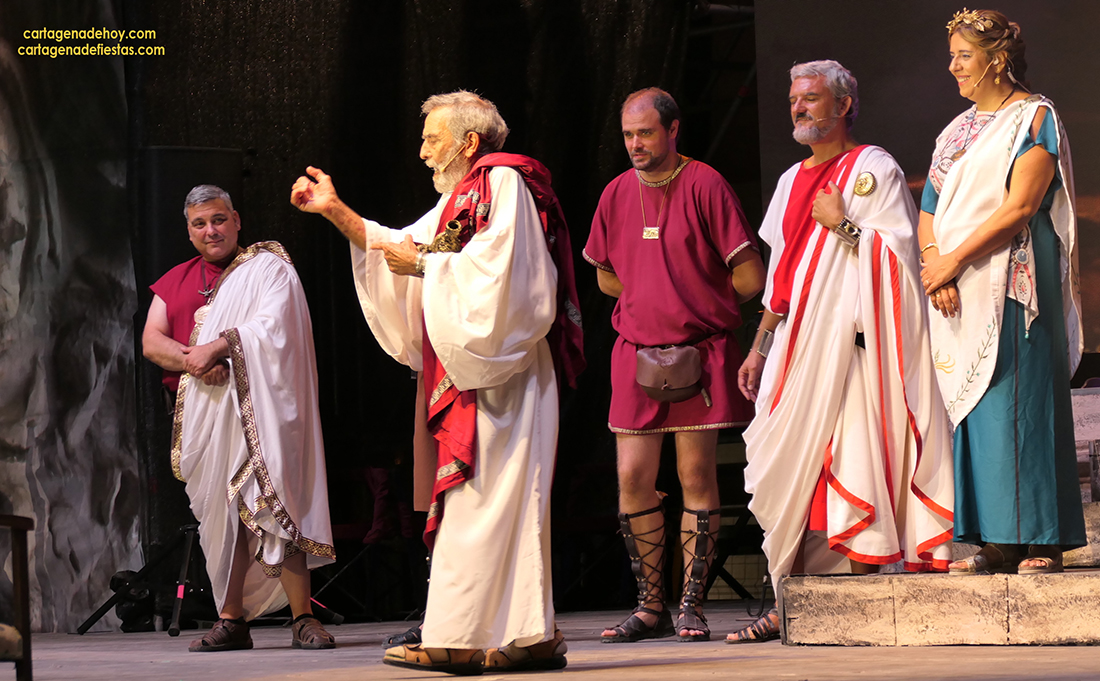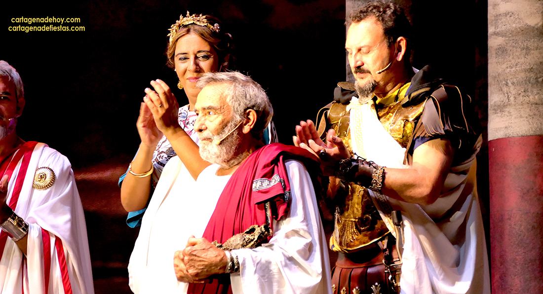 Tras concluir la representación teatral de los comicios, fue llamado Francisco Alarte al escenario. El motivo no era otro que tributarle un justo reconocimiento por su gran interpretación de Escipión en su vejez. “Estoy aquí gracias a Miguel Bastida, que un día me dijo que le ofrecieron un papel que él veía que era para mí. ‘Lo vas a bordar’, me dijo”, comentó, además de recordar que está en las Fiestas de Carthagineses y Romanos desde el Annus I con Collegium Consulum, y poner varias notas simpáticas con su cautivadora voz, como que el vestuario que anoche lució era el de su esposa (también del origen de las fiestas) porque no encontraba el suyo y que había acudido a representar el papel con varias lesiones, como si de ‘heridas de guerra’ se tratase. En concreto, llevaba cinco grapas en la cabeza de un golpe que se dio hace unos días más otras en brazo y pierna. Pese a todo, ahí estuvo, brillando otra vez, junto a su coraza, como el conquistador romano y con la idea de seguir en ese rol muchos años. ‘Ave, Alarte, que así sea’.