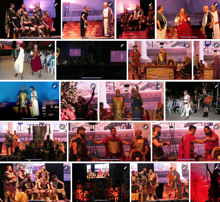 Aníbal convence a los almirantes de las fuerzas navales y a los caudillos de las tribus íberas para que lo acompañen en su osado plan de ir con un gran ejército a Roma cruzando los Pirineos y los Alpes. La obra, que duró cincuenta minutos, potenció su faceta interpretativa y tuvo la novedad de incorporar una escena cinematrográfica. En la imagen, Víctor Nieto (Aníbal) en la escena final y poco después, cuando fue aplaudido por todos en su despedida en el escenario del papel del estratega. GALERÍA DE FOTOS (pinchar aquí)